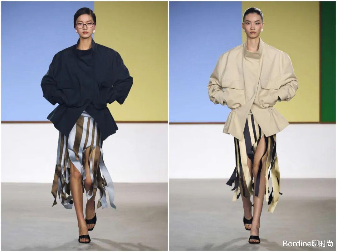 休闲的夹克上衣在藏青色、卡其色等颜色的低调大方中,纯色的简约也在廓形线条上增加了不少的休闲日常感,还在肩袖位置透着几分慵懒随性,以撞色条纹的裙装进行搭配,在条纹的经典中结合裙摆的切割流苏线条,则多了不少的设计感。