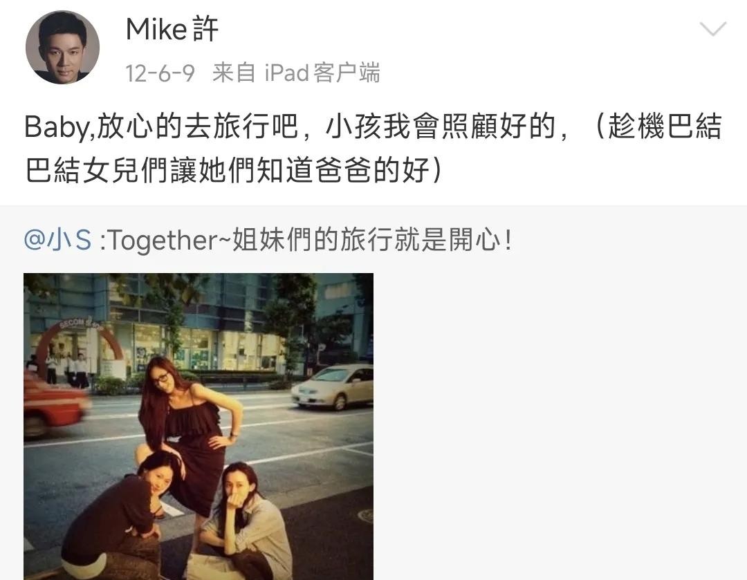 刚开始,画风可甜了!许雅钧那叫一个爱妻狂魔,微博全是小S和孩子的照片,一口一个“宝贝”,恨不得把全世界最好的都给她们。那阵子,许雅钧的社交平台真是大型秀恩爱现场,羡煞旁人。 感觉他眼里,小S就是最闪耀的星星。可谁能想到,这甜蜜的景象,竟然在2014年戛然而止了呢?