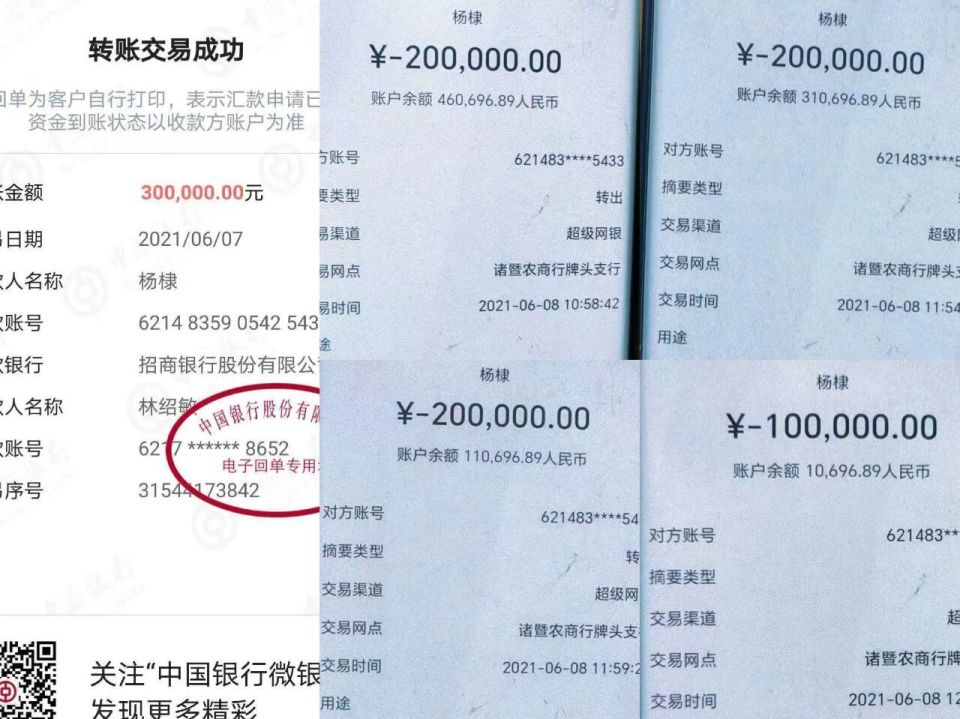 围绕这300万元律师费的去向,成为纠纷中最受关注、也最具争议的部分。2021年6月,张永树按照杨棣的要求,向其本人名下的招商银行账户转账100万元。