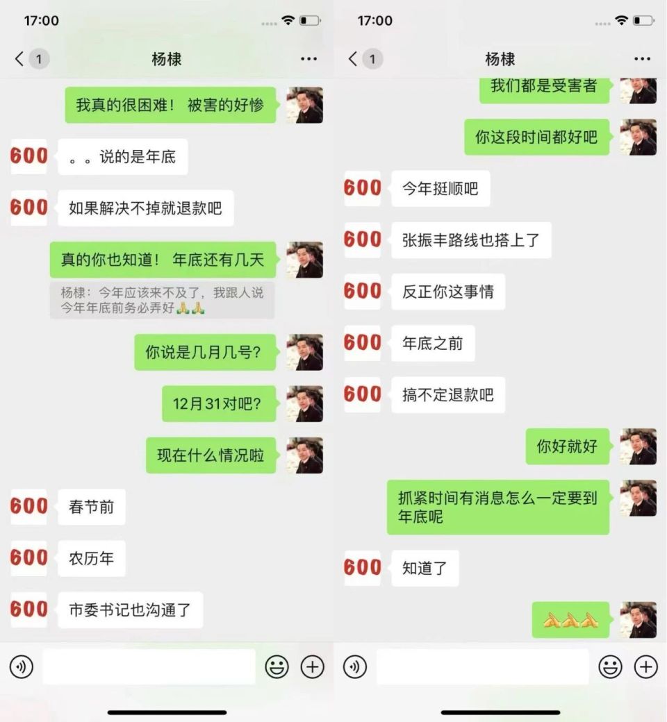 微信聊天记录等证据显示,2023年12月18日,杨棣律师通过微信向张永树表示,“解决不掉就退款吧”。但张永树此后多次向其索要,杨棣律师却以各种理由,反复拖延与推诿,退款始终未能落实。2024年,张永树称自己“被害得好惨”,资金非常困难,急需这笔钱,杨棣承诺“先安排第一笔”,也始终未兑现。