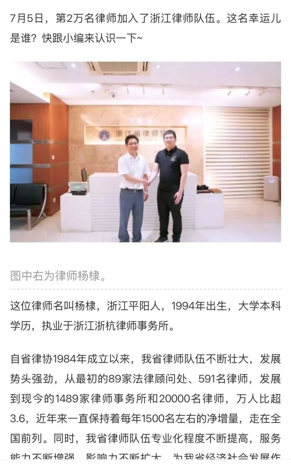 笔者检索发现,在2017年浙江省律协一篇宣传报道中,杨棣还被描述为浙江省的第2万名律师,并配上了其本人照片。