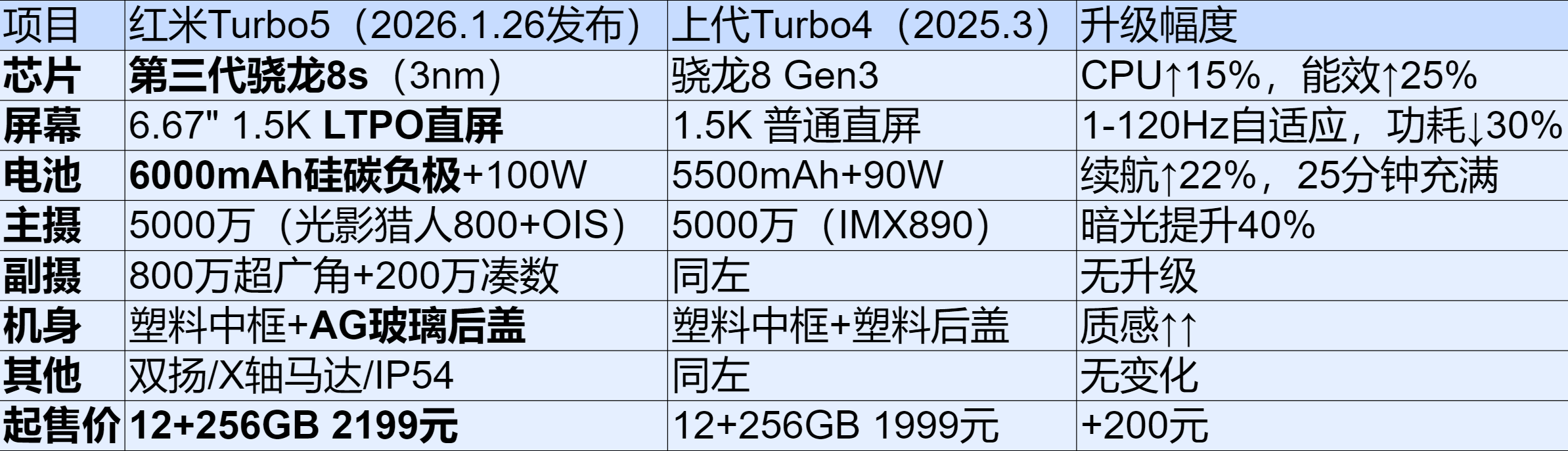 三、价格竞争力:同价位“性价比之王”Turbo5系列的定价策略延续了红米“性价比屠夫”的风格,标准版与Max版均处于同价位“地板价”: