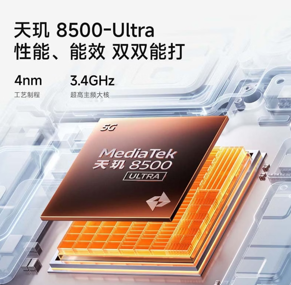 l标准版(Turbo5):全球首发天玑8500-Ultra(台积电4nm工艺),采用8核A725全大核架构(3.4GHz超大核+3.2GHz大核+2.2GHz能效核),安兔兔跑分突破220万分,直逼前代旗舰骁龙8 Gen3。实际游戏中,《原神》最高画质+60帧连续运行1小时,帧率波动仅2.3帧,机身温度控制在42℃以内(得益于超大VC液冷散热),完全满足主流游戏需求。