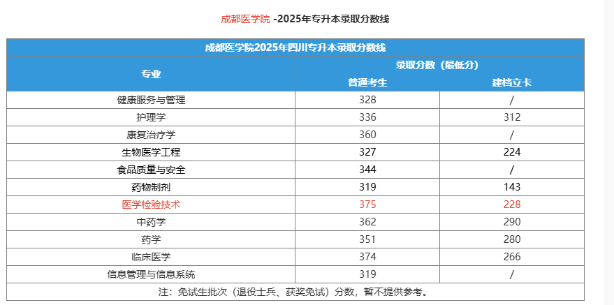 成都医学院 2025 年专升本普通批最低录取分普遍在 320 分以上:
