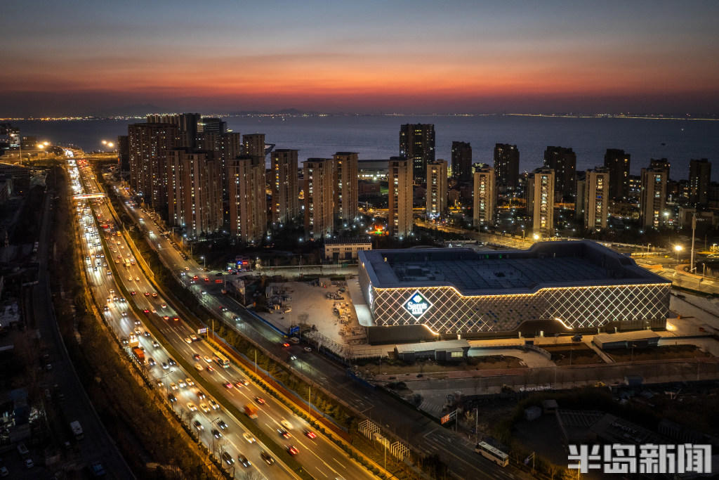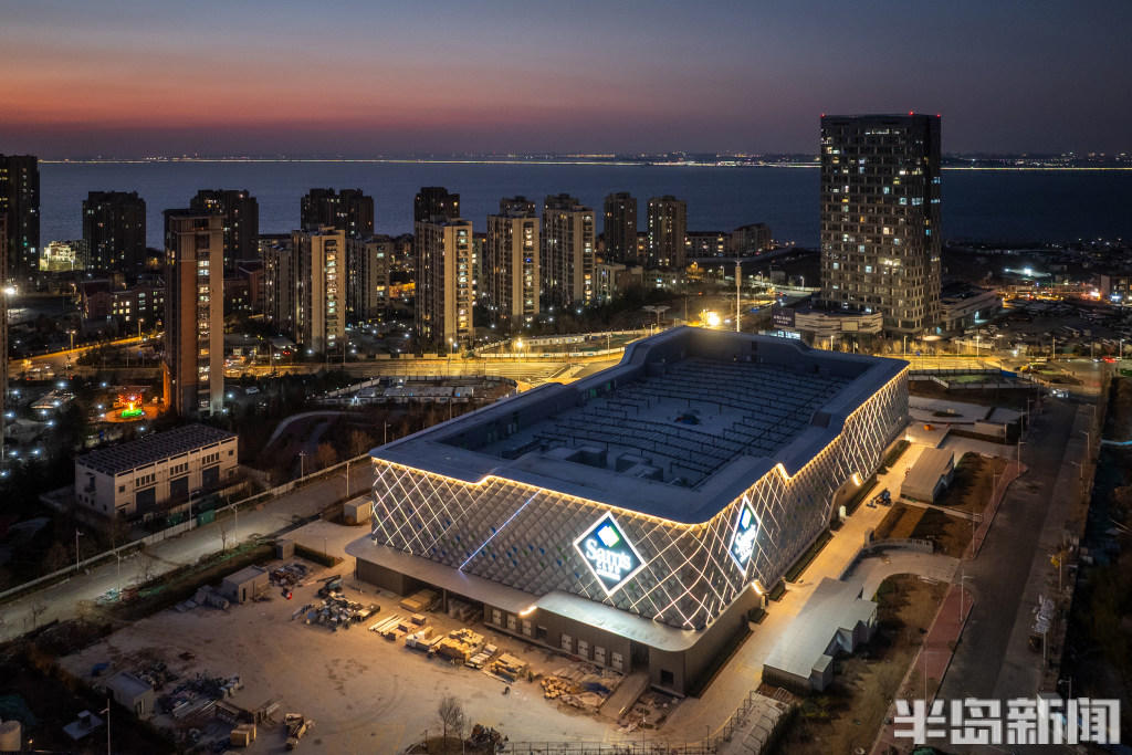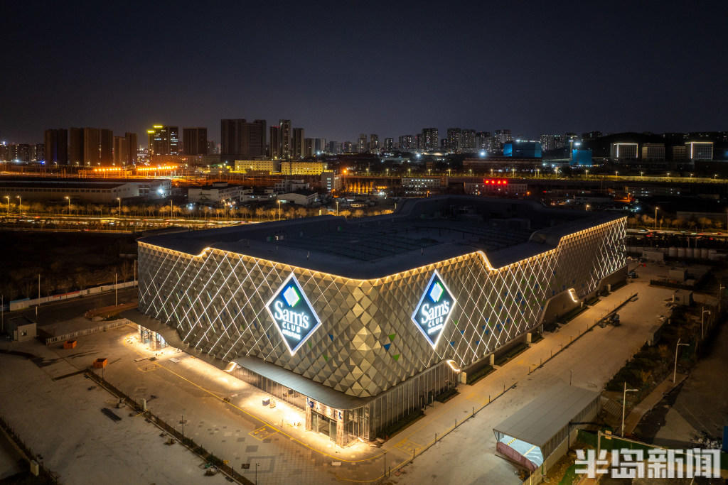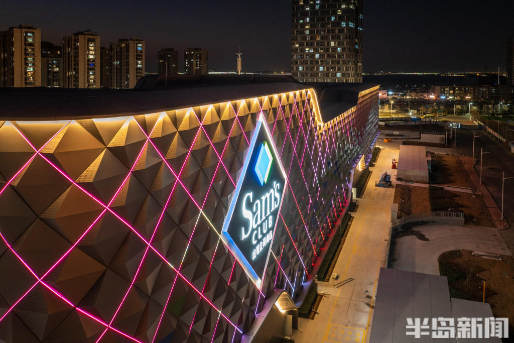 1月7日晚,青岛山姆会员商店主体建筑灯光点亮,仿佛一座“光立方”闪耀海滨。