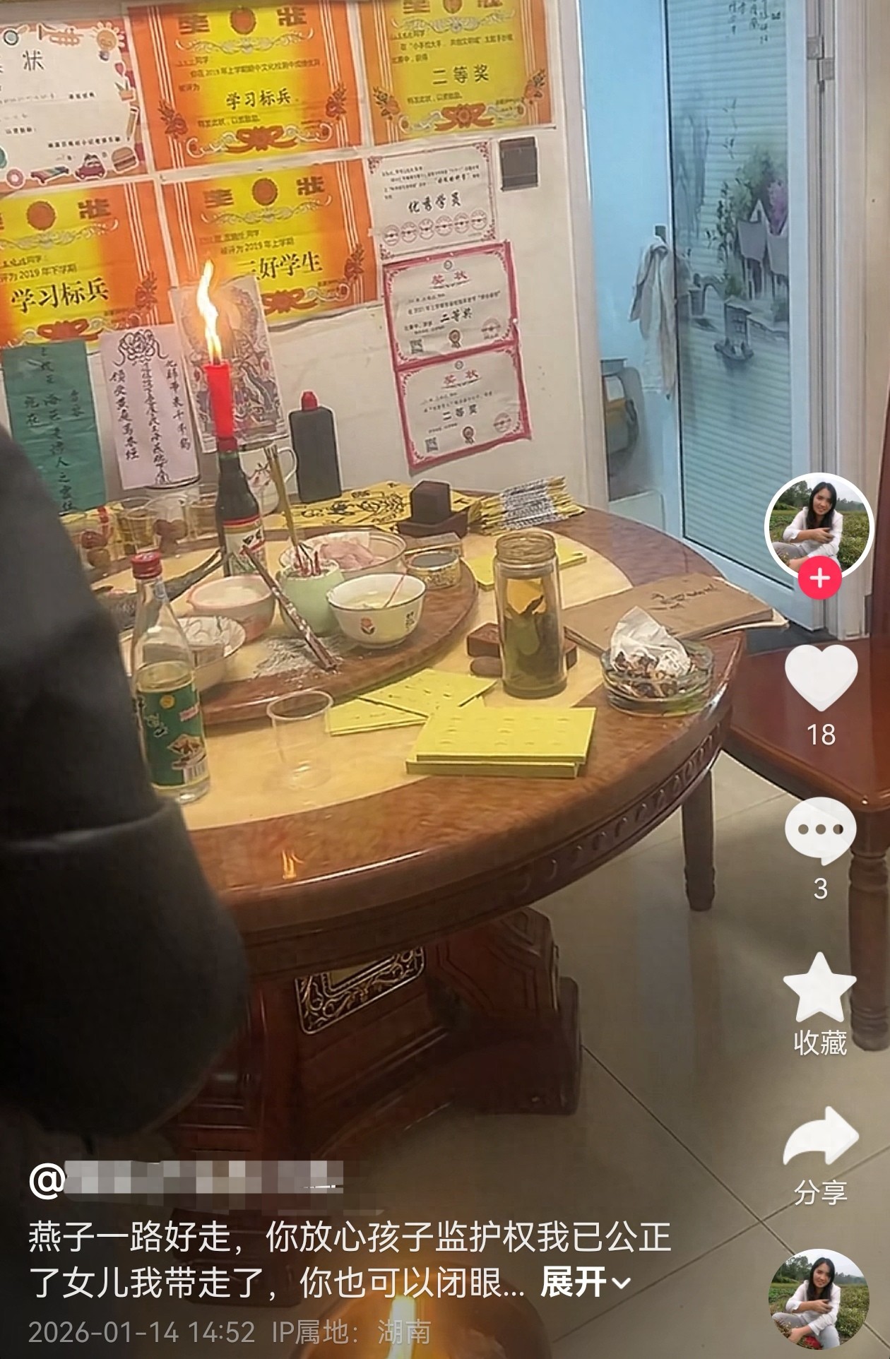 从画面来看,做法事的师傅不让公开照片,只看到牌位和祭祀用品,但非常醒目的是,燕子家的墙壁上贴满了女儿在学校获得的各种奖状,包括三好学生、学习标兵、奖学金等。