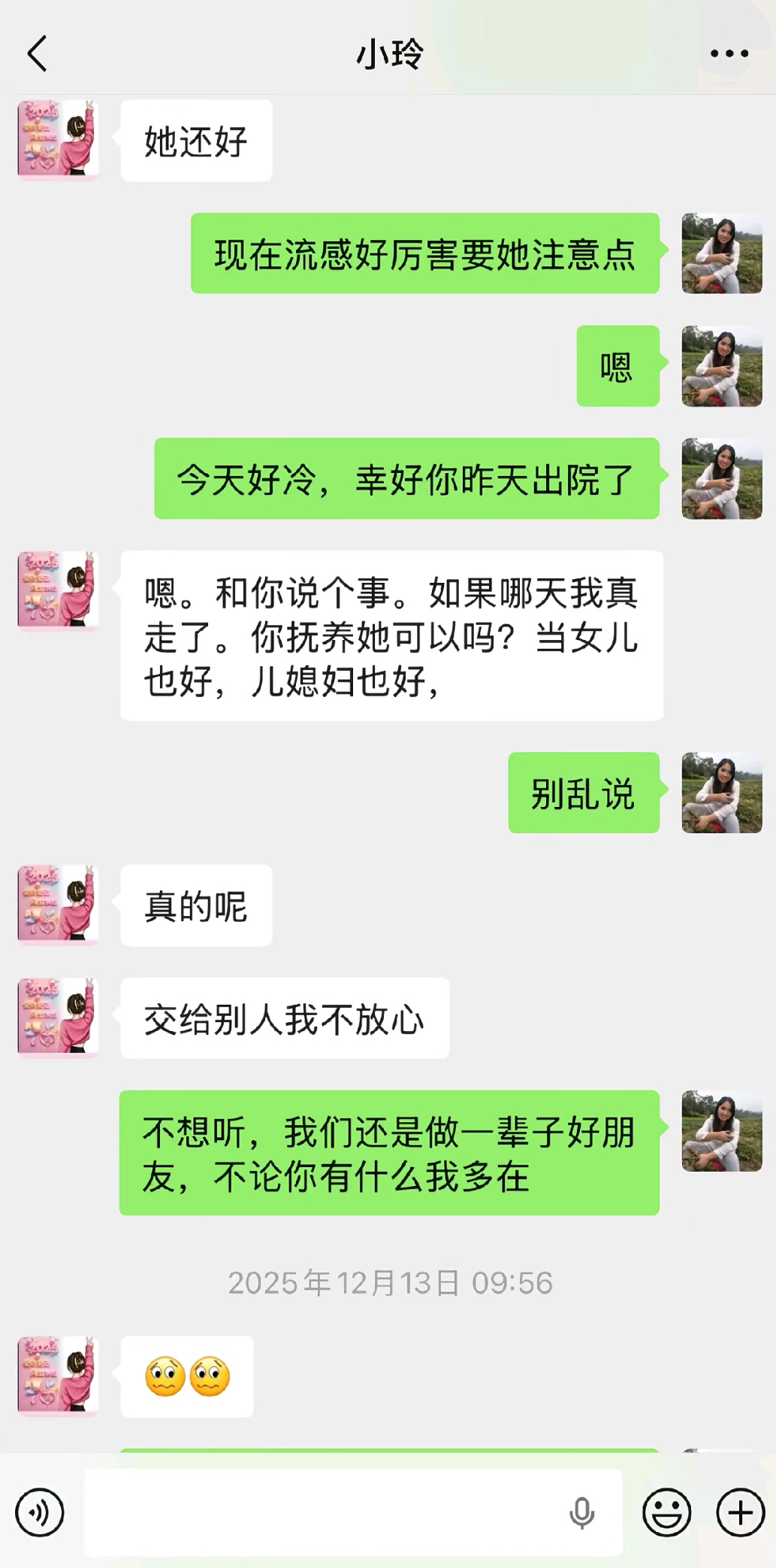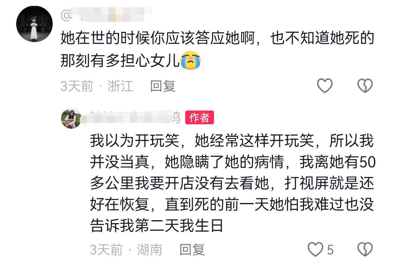 在不到一个月前,燕子和闺蜜聊天,当时刚从医院回来不久,她就告诉闺蜜,如果哪天自己离开了,希望闺蜜能帮她抚养女儿,因为交给别人她不放心。