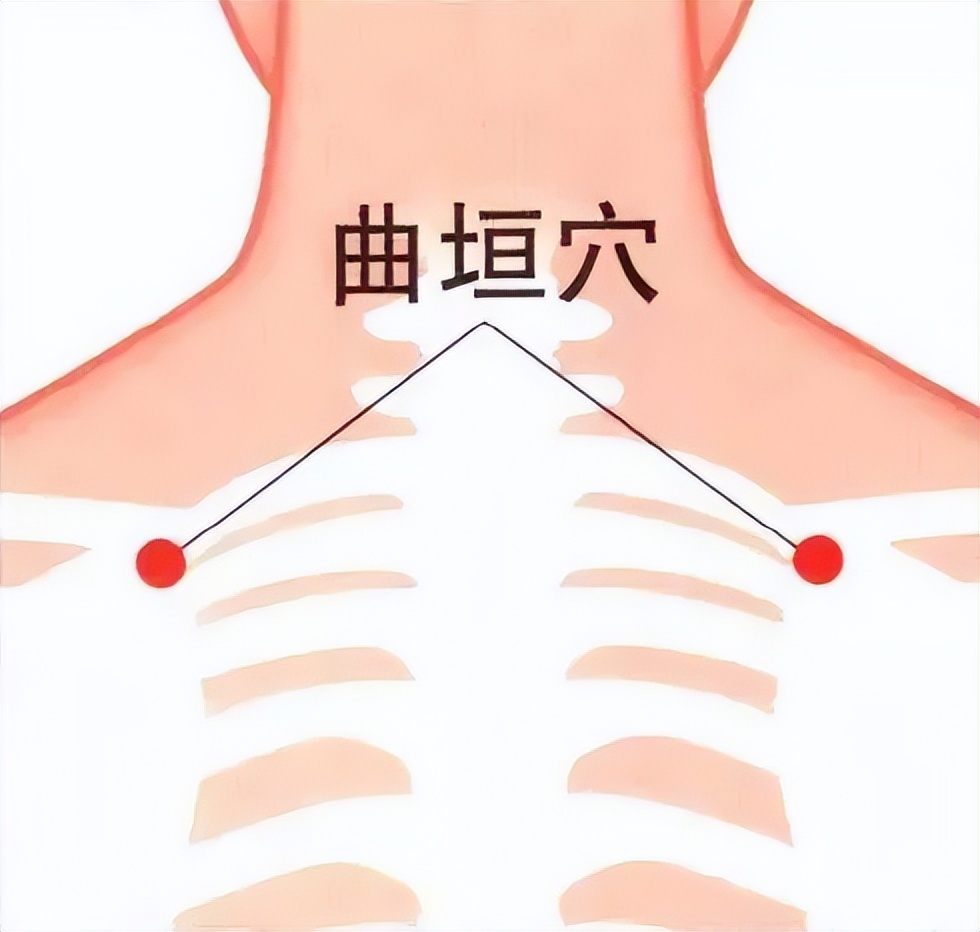 穴位定位:在这条大筋的末端,肩胛骨上缘内侧,差不多平对第二胸椎处的凹陷处就是曲垣穴,左右各一。