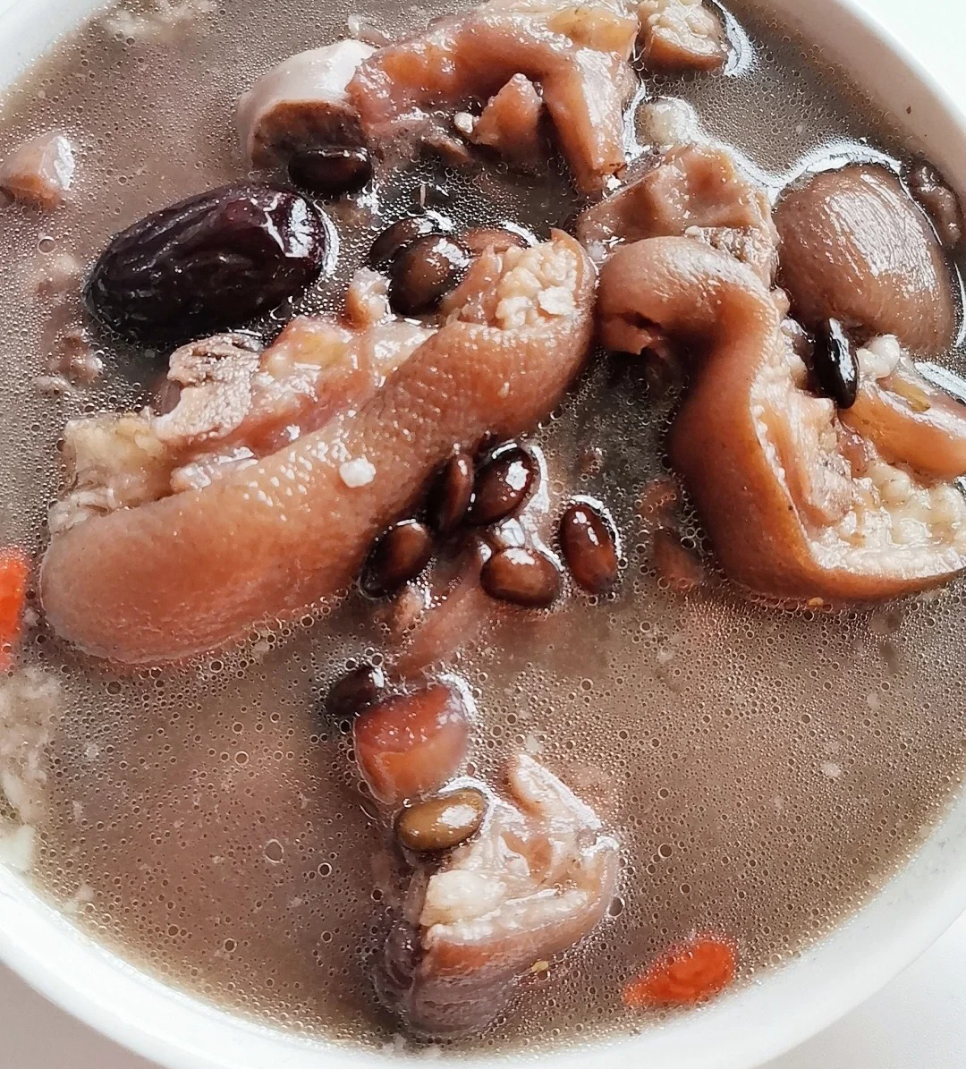 做法:猪脚焯水后,与泡好的黑豆、红枣、姜片一同放入锅中,加足水,小火慢炖2小时,出锅前加入枸杞和盐调味即可。