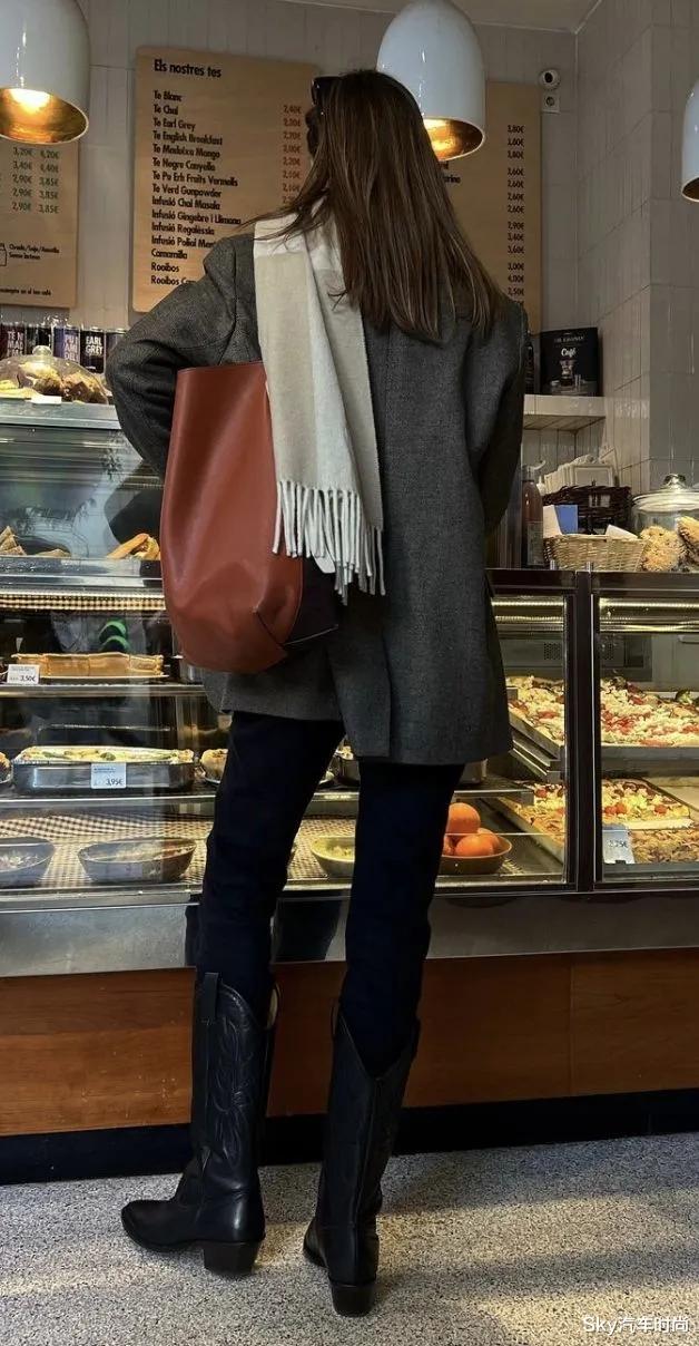 相对都中庸的裙子+长靴,对比不算太鲜明,但因人物本身的气质加成,最终也会导向飒美优雅风。下图博主的一身灰色穿搭,恐怕就是最佳答案。