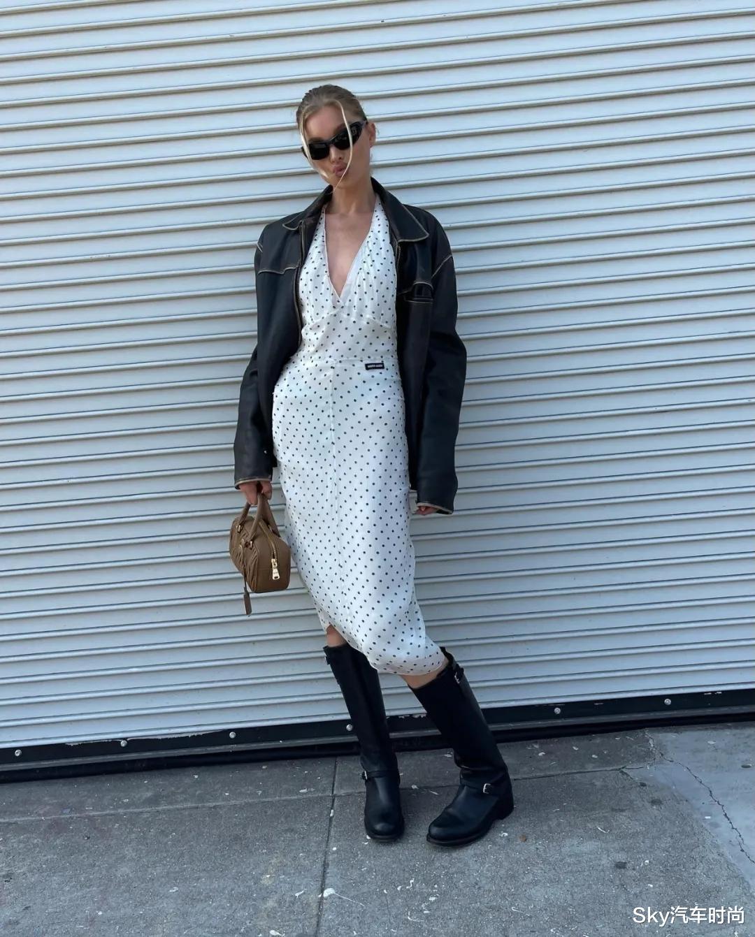 皮衣,配白色长衬衫裙,不用怀疑,这是鲜明的直曲混搭。一双精致长筒裙的调和,为这份飒美,加了精致与讲究。帅美与优雅,从不针锋相对。它们一旦联手,必能造就时尚传奇。