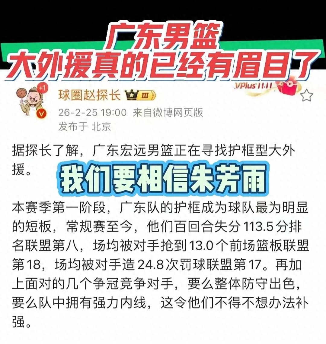 据知情的媒体人爆料,广东队接下来的引援计划曝光,球队正在寻找护筐型的人大外援来弥补球队的致命弱点。这一次朱芳雨不再低调,目前已经瞄准了内线大外援,广东队接下来如果能够引进一名内线的大外援,那么球队的实力将会更强,让广东队有了争冠的实力。