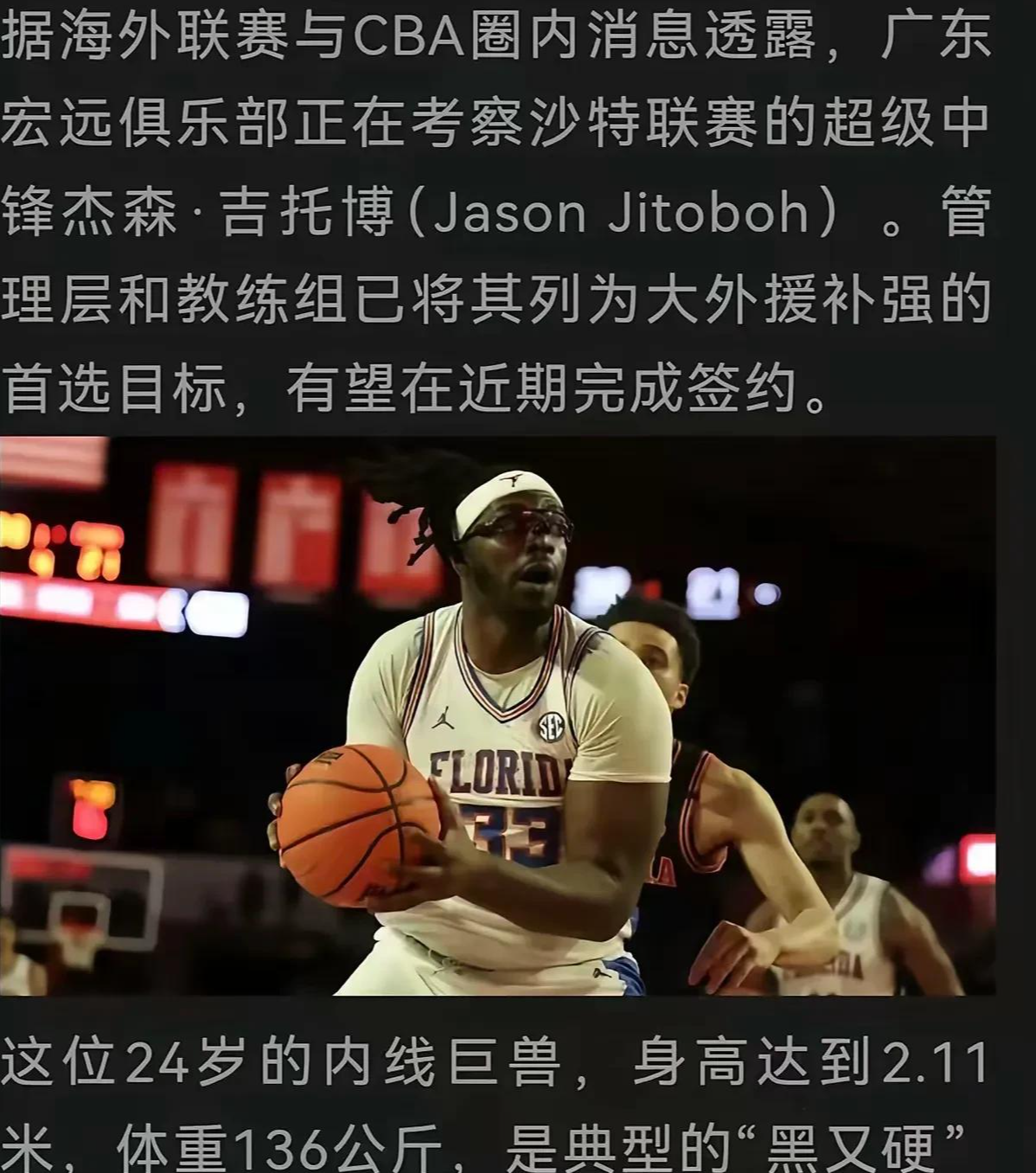据了解,目前朱芳雨已经瞄准了一些人选,其中有一人就是沙特联赛的2米11的超级中锋杰森·吉托博。目前广东正在考察他,这名2米11的超级中锋有望能够加盟广东队,成为广东队争冠的最后一块拼图。