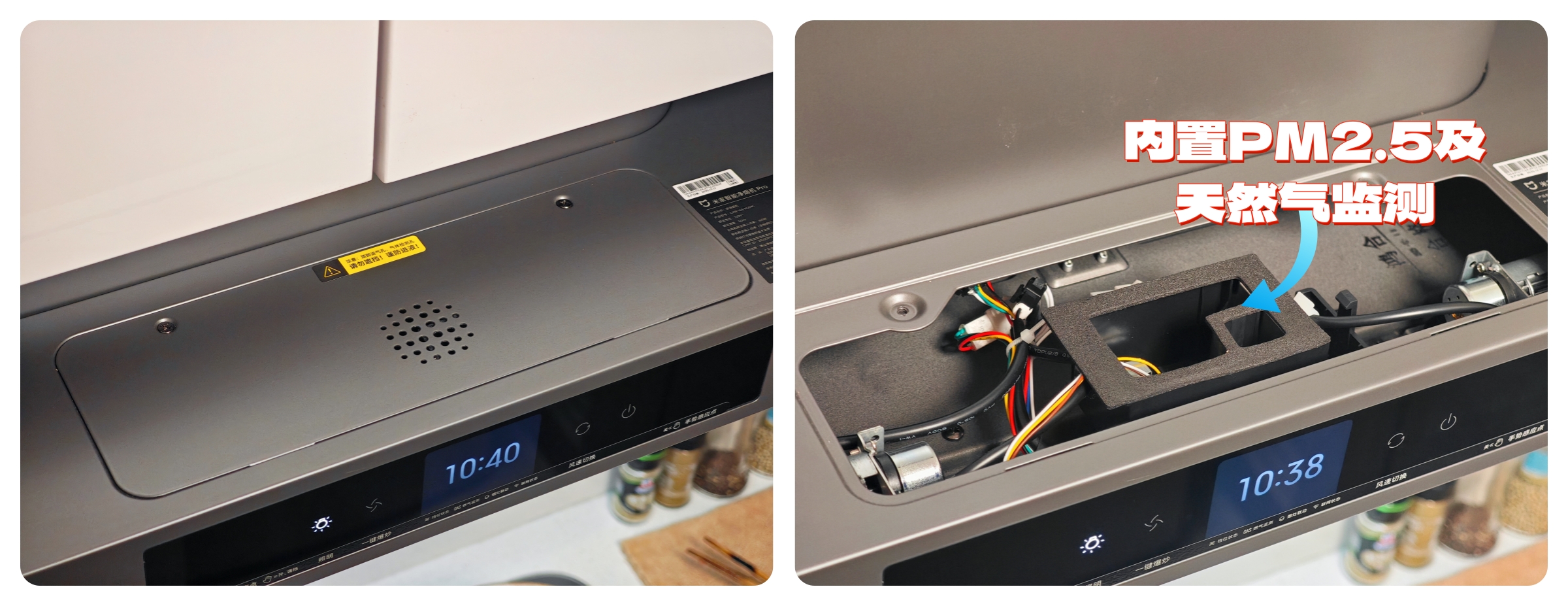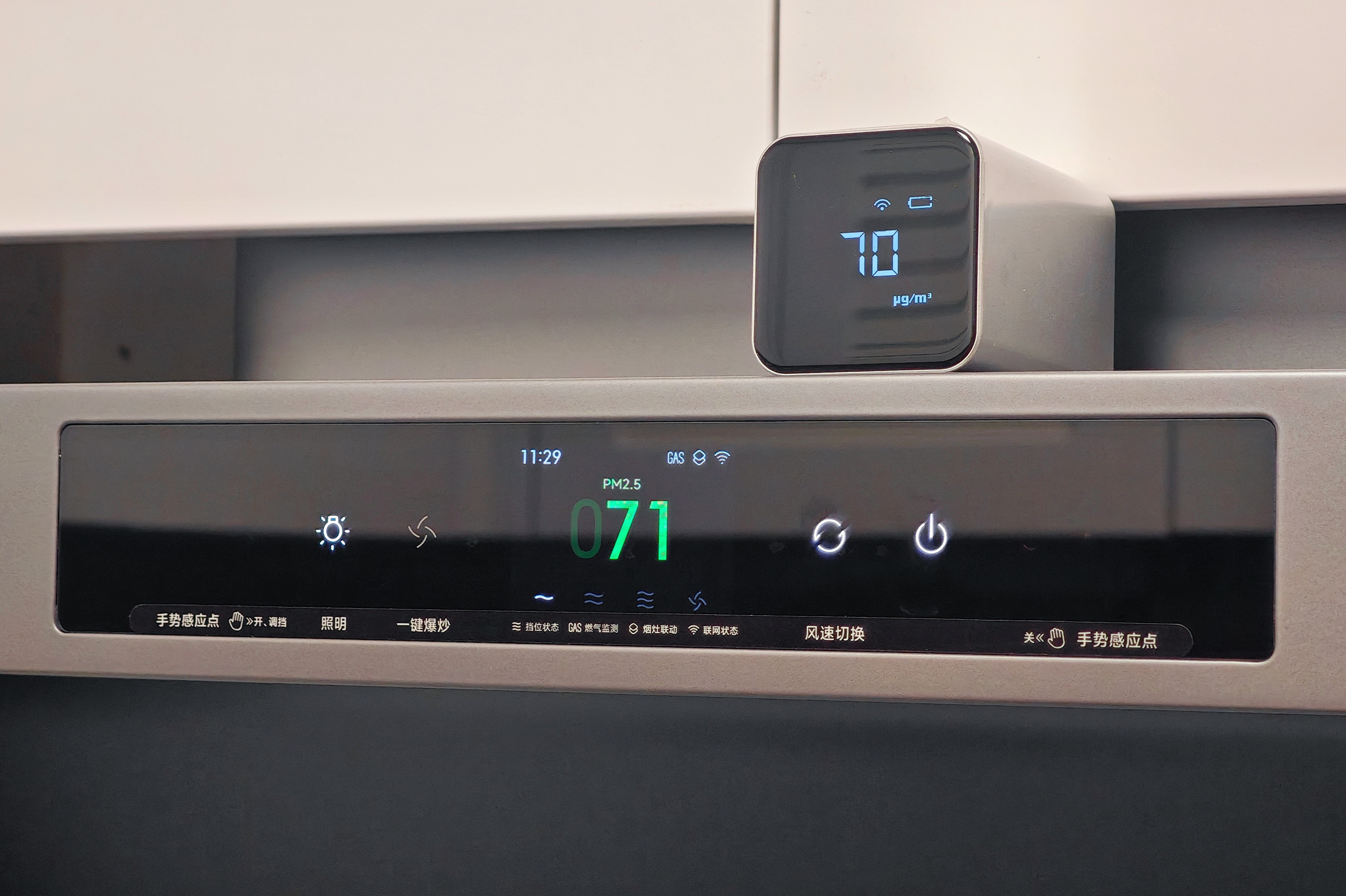 ▲前面提到米家净烟机Pro的高清大屏可以 实时显示PM2.5数值,事实上它还能够实时监测天然气浓度,并且未开机的情况下,PM2.5与天然气监测都是 7*24小时不间断监测的。