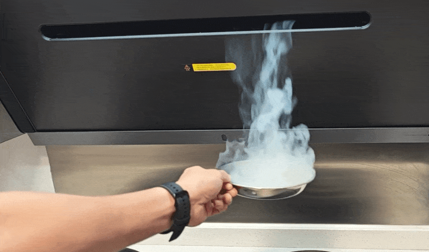 ▲把燃烧的烟饼在一字型吸风口左右移动,可以看到米家净烟机Pro吸风口的各处都能够保持强效吸入,并且能明显看到其专利黑科技——空气动力学设计形成的 动态微粒捕集气旋 ,有效避免烟雾逸散,一点都跑不了!