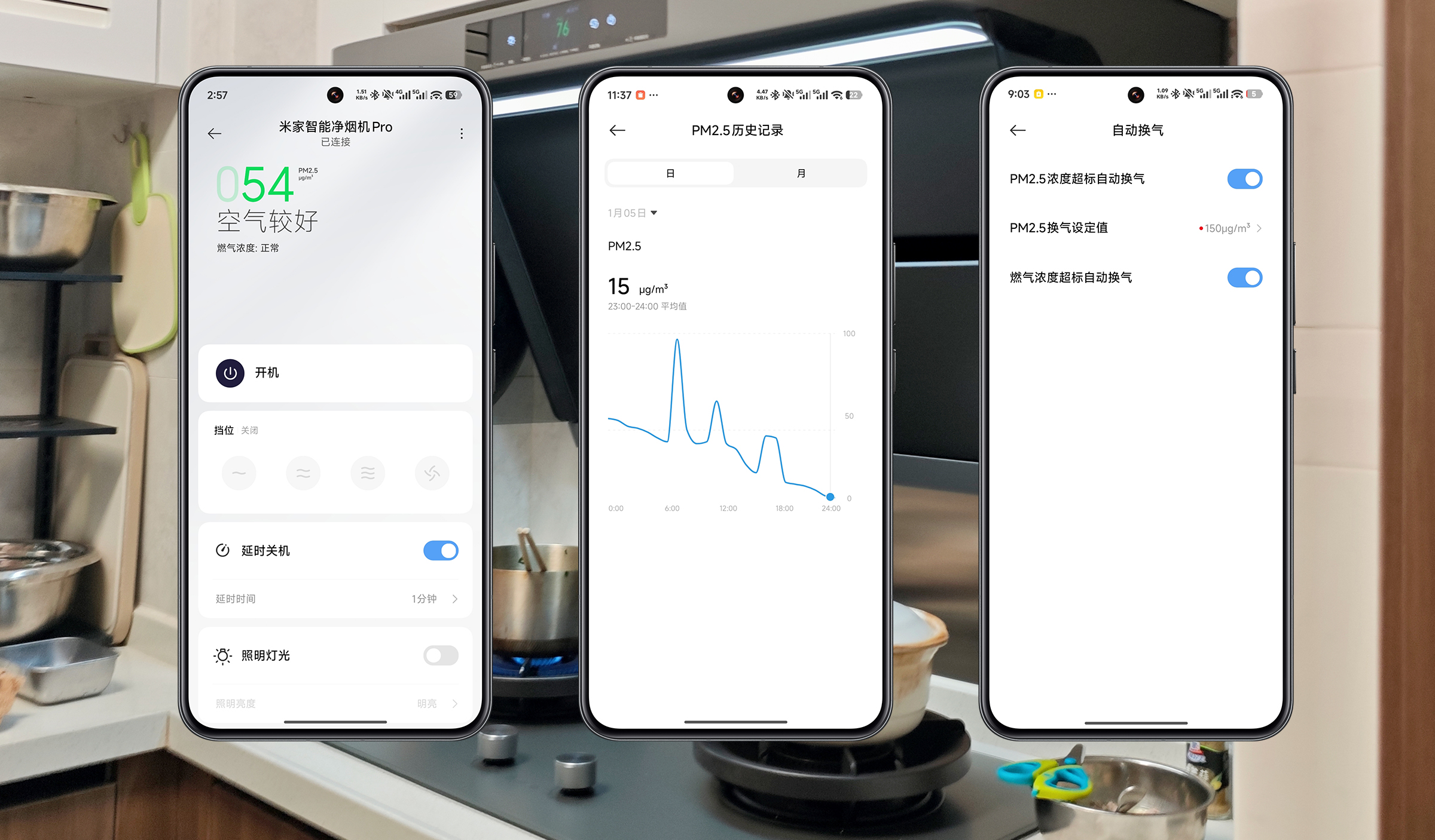 ▲有时候爆炒之后,油烟还没散尽,立马关机的话,厨房内的PM2.5浓度依然很高。通过米家APP设置后,一旦监测到PM2.5数值超过设定值,米家净烟机Pro就会 自动启动换气,将厨房的PM2.5颗粒吸除出去,保障了空气质量。