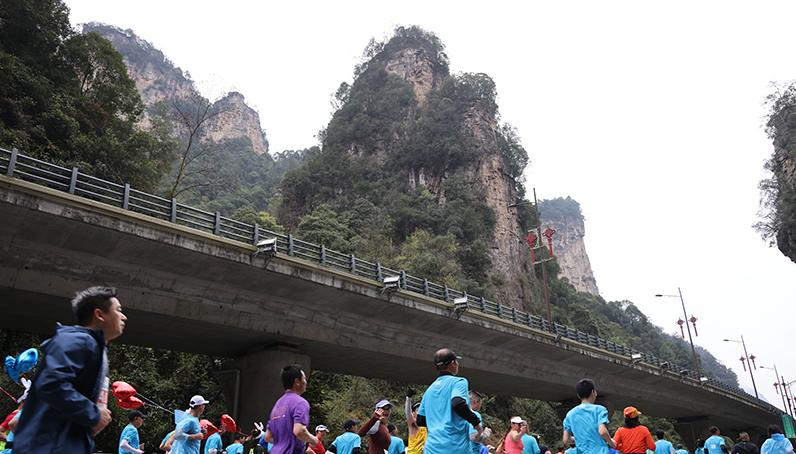 一场马拉松赛,贯穿了张家界武陵源的独特自然景观:巍峨的山峰、茂密的森林、清澈的河流和文化地标景点。