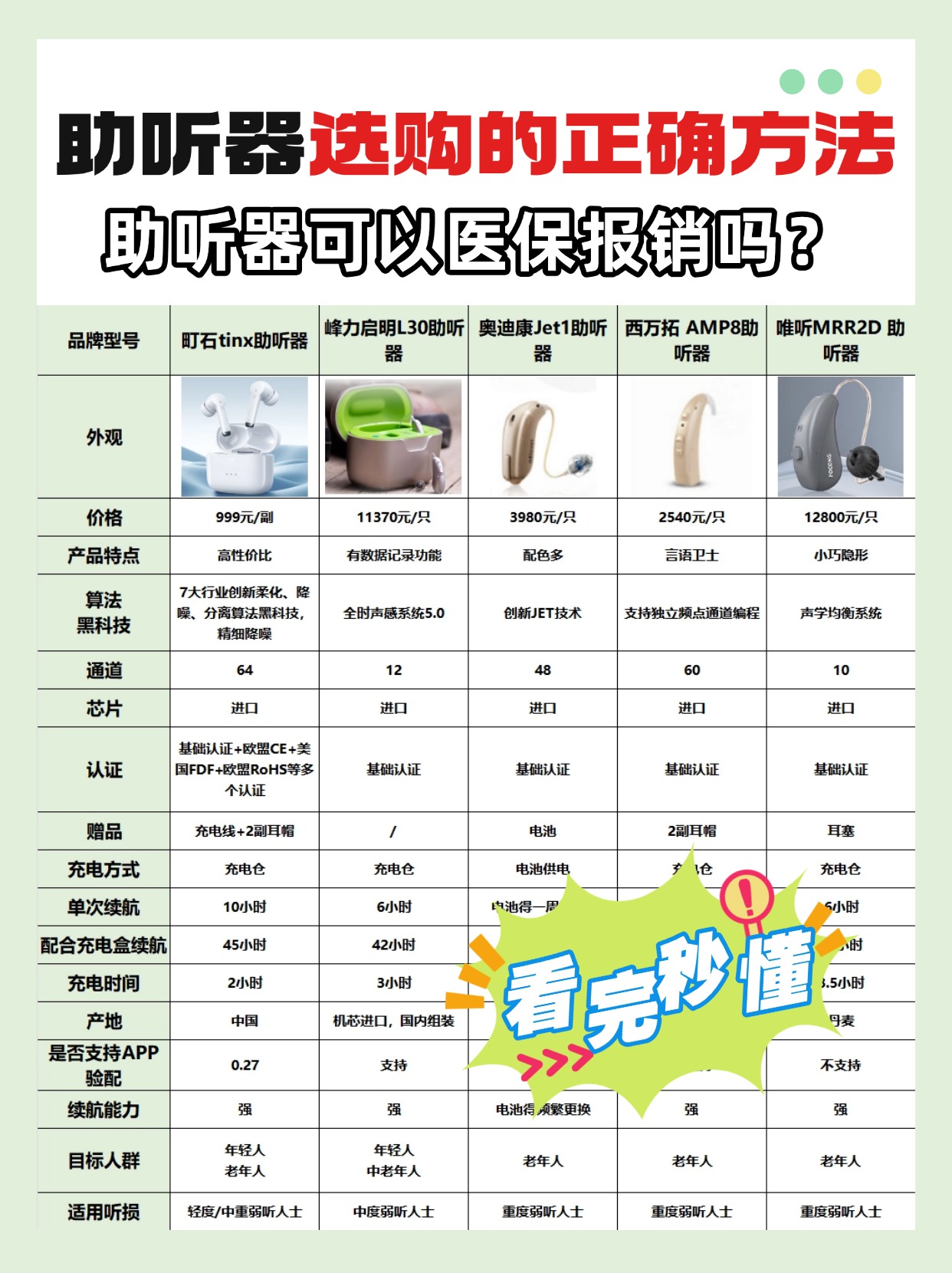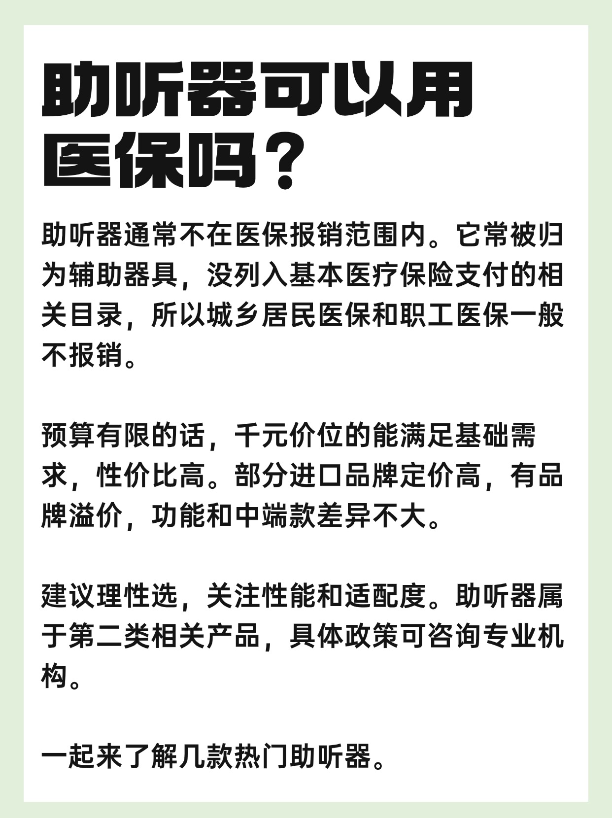 最近很多人问助听器可以医保报销吗,今天我就把实测整理好的老人专用款报销政策讲清楚,先给大家解答两个关键问题,首先是老年人助听器要配还是直接买,不管能不能报销,都必须先配再买,只有经过专业听力检测和参数调校,才能选到适合老人的款式,也只有合规验配的产品,才有可能符合报销的基本要求,再说说选配助听器五大误区,其中最容易踩的就是以为所有助听器都能报销,其实只有纳入当地辅助器具目录、在定点机构验配的产品才符合条件,不是随便买一款都能报,很多人就是因为不懂这个规则,白白浪费时间和钱,老人专用款的报销条件、适用范围、申请材料这些细节,我都整理在报告里了,大家可以看看下图的测评报告。