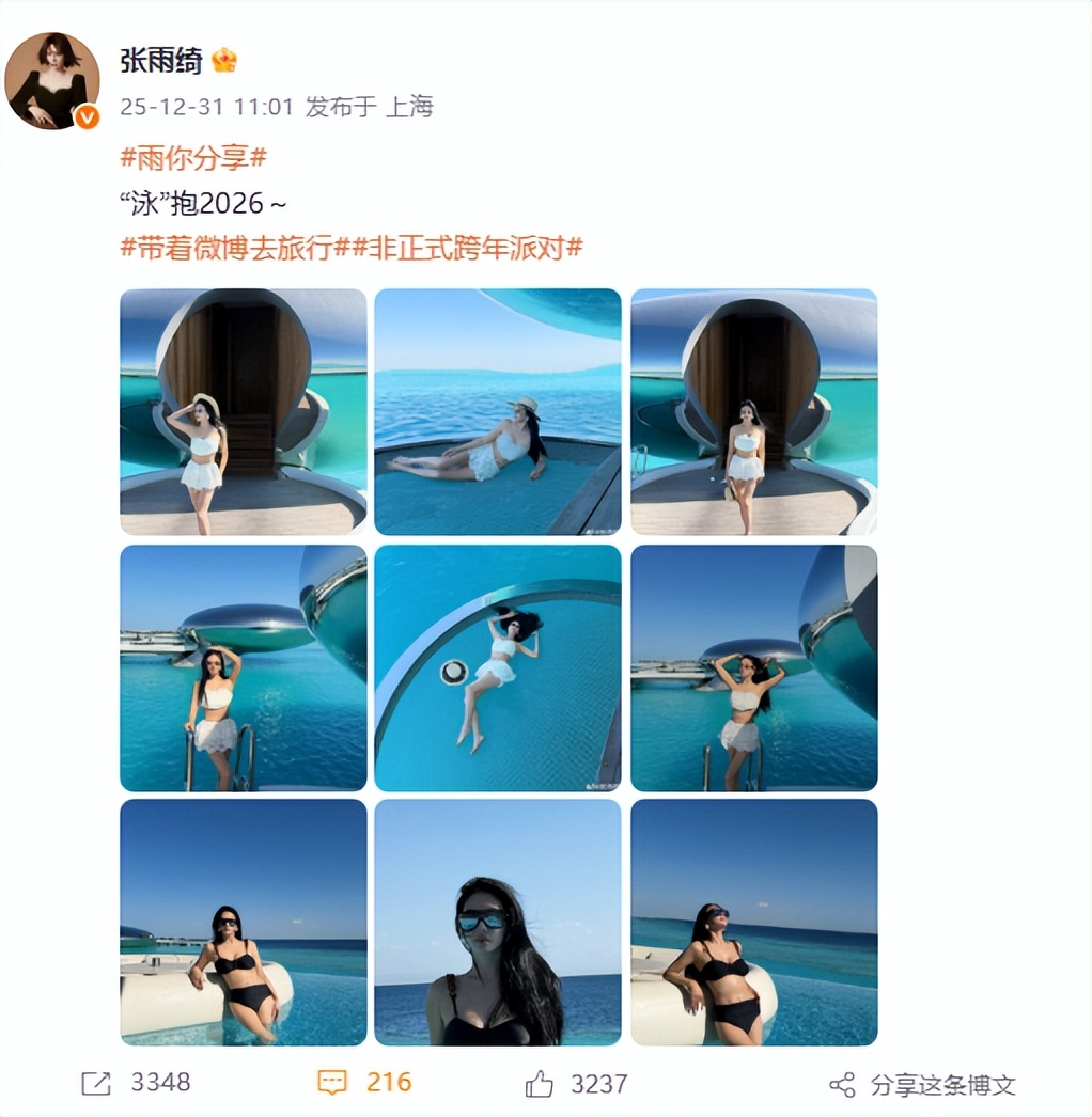 12月31日当天,微博里各有各的跨年夜,而女星张雨绮却甩来九张浸着海水蓝的火辣大图,配文 “泳抱 2026”, 没有刻意的仪式感,全是天人合一的自然风景!
