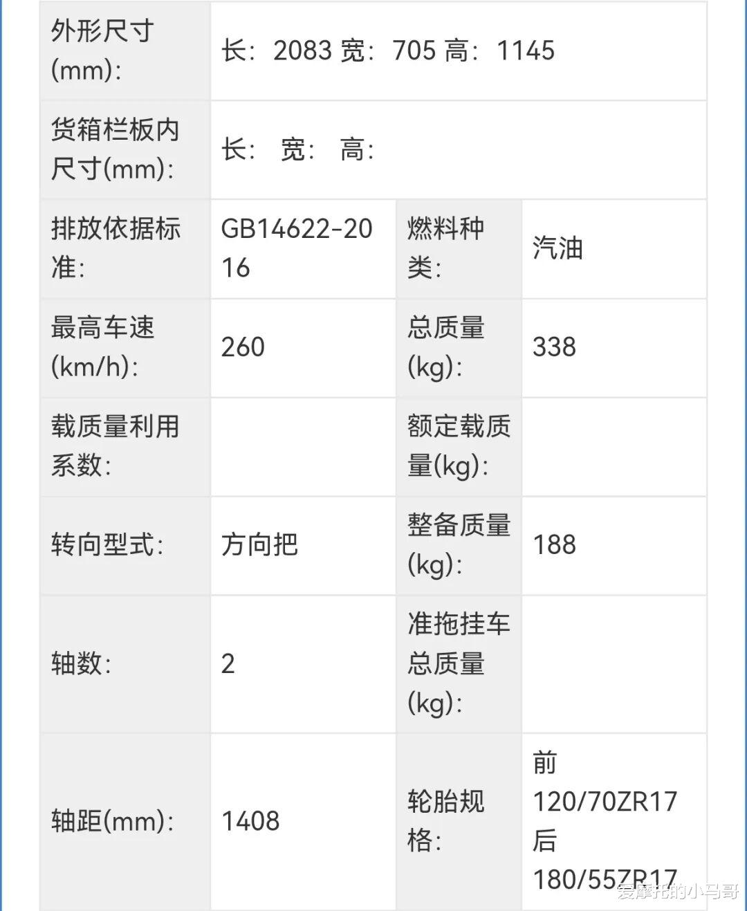 相较于申报的赛250来说,动力参数的改变反而更大一些,从 20.5kW变成了21.5kW,目测应该是重新优化了原来的那个动力平台,配合150kg的整备质量,可玩性还是有的。