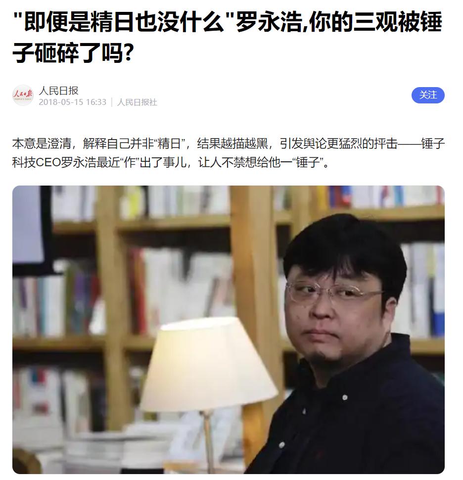 罗永浩的自我意识太过强烈,早在2018年5月份,罗永浩因为锤子科技的事件就曾遭到网友的怒怼,同时也被人民日报点名。
