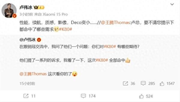 此前,王腾直言K80比13更强,配置大于13,且价格低于13。卢伟冰也直言:“K80太强了,强得让王腾有点‘飘’呀”。