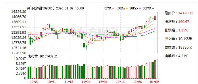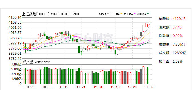 A股三大指数今日延续上攻步伐,沪指16连阳站上4100点,再创逾10年新高。截止收盘,沪指涨0.92%,深证成指涨1.15%,创业板指涨0.77%。沪深两市成交额突破三万亿,较昨日放量逾3000亿。