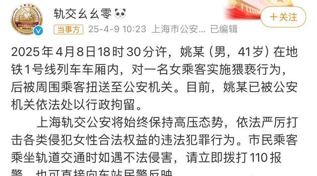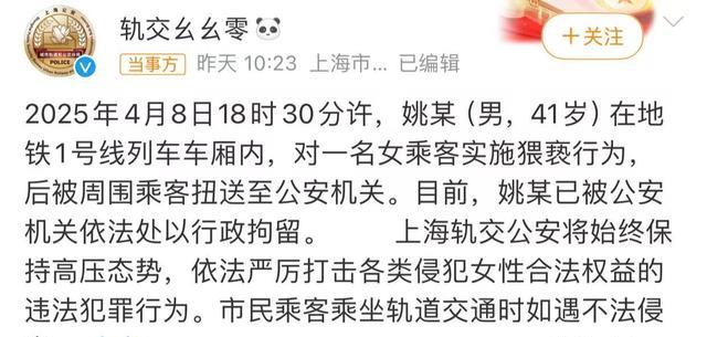 [1] 官方账号 轨交幺幺零2025-04-09 《2025年4月8日18时30分许,姚某(男,41岁)在地铁1号线列车车厢内,对一名女乘客实施猥亵行为,》