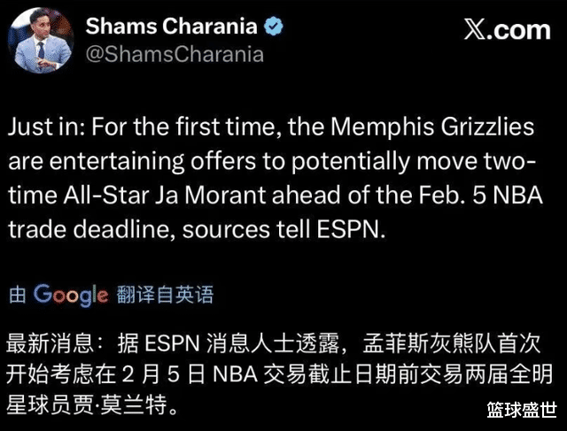 面对这一连串的风波,灰熊也终于不忍了。近期报道,莫兰特已经正式被灰熊放入交易讨论之中。而相比于此前的流言消息,业内人士爆料,莫兰特在今年交易截止日(2月6日)之前,基本已经大概率离队了。