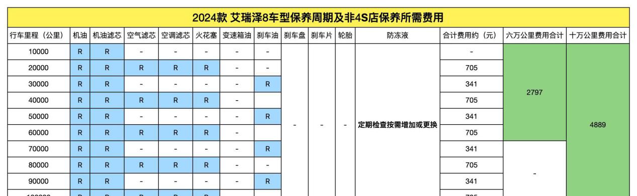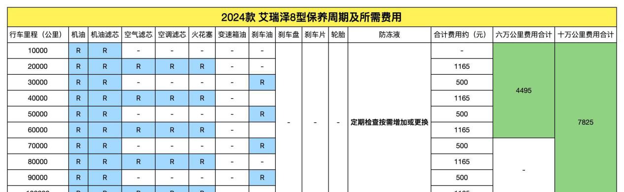 根据官方数据,艾瑞泽8行驶6万公里的保养费用大约为4500元,10万公里大约为7800元。如果按照每年行驶2万公里计算,平均每年的保养费用在1200元左右。这个价格,在同级别车型中属于中等水平,不算特别突出,但也绝对不坑人。