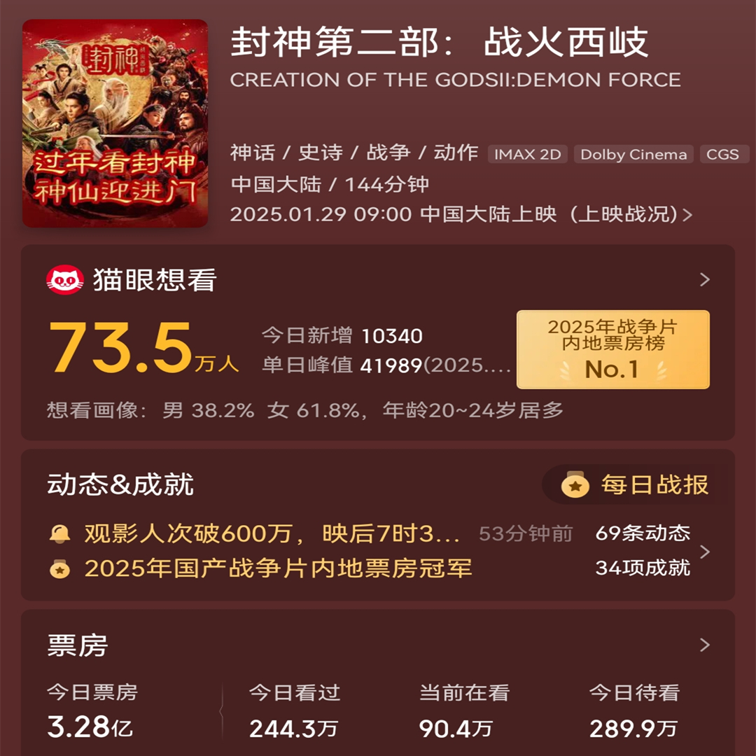 《封神第二部:战火西岐》以3.28亿的票房成绩排名第三。