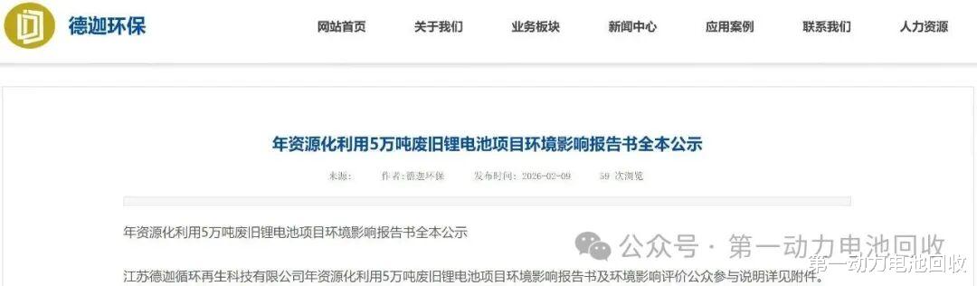 第一动力电池回收消息,近日,德迦环保官网发布了《江苏德迦循环再生科技有限公司年资源化利用5万吨废旧锂电池项目》环境影响报告书全本公示。