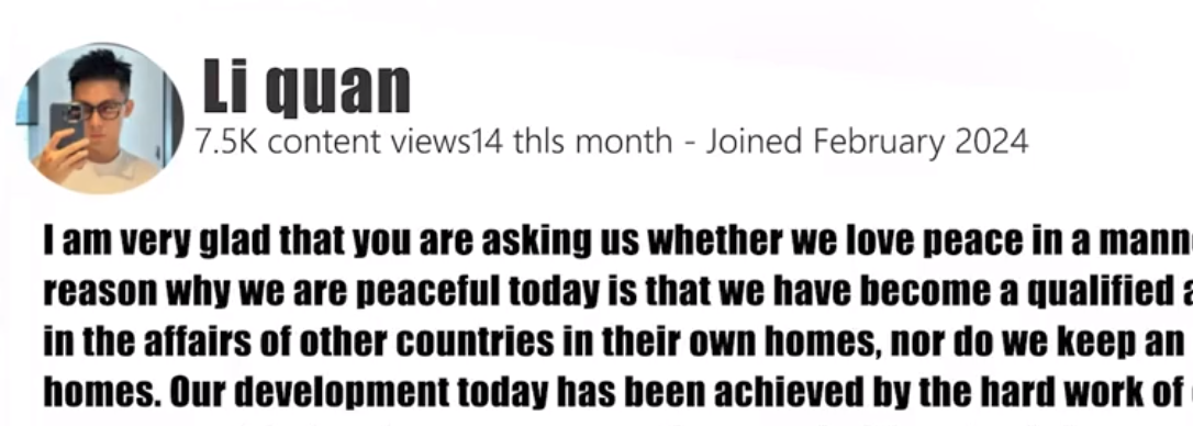 首先来自我们中国的网友说道:很高兴你们现在是以商量的态度来询问我们是否热爱和平。我知道我们如今能享有和平,完全是因为我们已经成为一个合格的对手。我们从不插手其他国家内部的事务,也不会盯着别人家里流出的石油。我们的发展从未抢夺过别人的资源,也没有对别的国家进行殖民掠夺。我们今天的成就靠的是每一个中国人的辛勤努力。你们说我们热不热爱和平?相比你们,我们更珍视和平。我们不但热爱和平,还愿意传播和平。在过去的一百多年里,我们的先辈就告诉我们,只有你足够强大,只有你的拳头够硬,别人才会愿意跟你谈和平。事实证明他们是对的。如今的我们生产武器只是做好随时应对冲突的准备,从未想过去攻击别人,我们国家有句老话叫:人不犯我我不犯人。