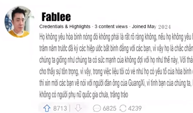 来自越南的网友这样表示:他们热不热爱和平?这不是显而易见吗?如果他们不热爱和平,我们早就遭殃了。如果你们所说的和平是要他们像一百多年前那样跟你们签订各种不平等条约,那他们肯定是不和平的。如果你们愿意好好跟他们谈和平,哪怕像我们这样与他们实力不对等,我们也没感受到他们明显的敌意,反而他们更愿意展现出尊重。所以在我看来,他们是否和平,更多取决于对手是否愿意和平。最后,如果中国人看到,那么请你们回去告诉广西的男人,为了我们的友谊,请停止过来娶走我们女人的行为,这让我们越南男人很无奈。
