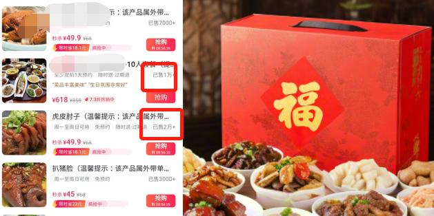 有酒楼把“打包年菜”演化出了两种形式: 一是预订外带,即用餐时前往酒店打包,带回家现吃; 二是购买预制礼盒,食用时简单复热即可。笔者家乡一家饭店的抖音团购上,有多个春节 单品团购销量达到2万+。