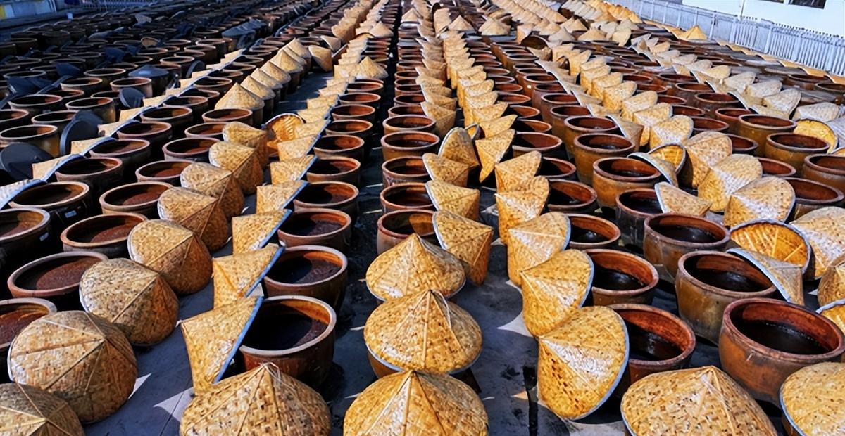 松盛酱园的一口口陶缸在阳光下静静等候,每一个都装满了浓郁的酱料,带着铁皮斗笠的巨大土陶缸里藏着百年的老味道,也记录着这座城市的记忆,微生物在缸中沉睡又苏醒,在漫长的发酵过程中散发出阵阵酱香,让这个乍暖还寒的季节多了几分人间烟火气。