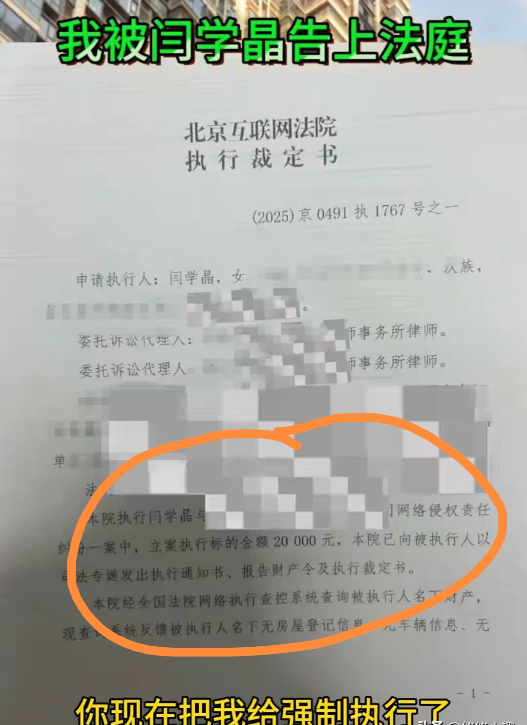 没想到12月31日,有位自称是闫学晶粉丝的一位男子在平台上发视频说被她告上法庭起诉了,“闫学晶让我赔她20万,希望她可怜可怜我,放过我吧!”