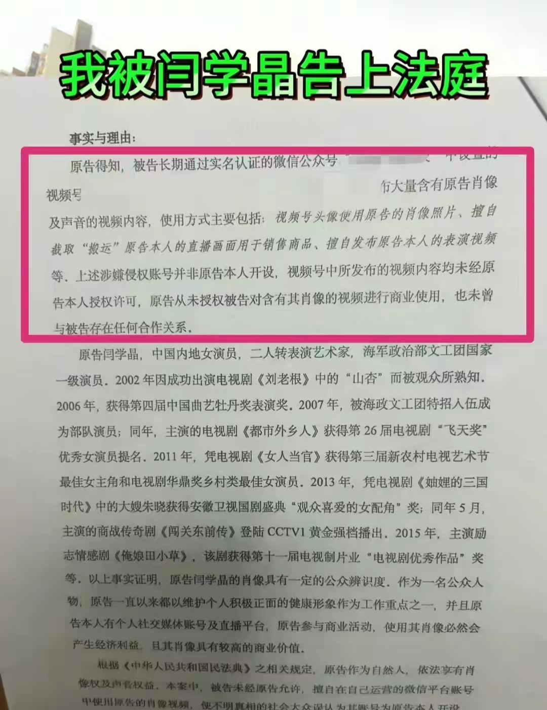 他长期通过使用闫学晶的视频,销售商品,发布表演视频牟利,用作商业用途,所以被人家给起诉了。