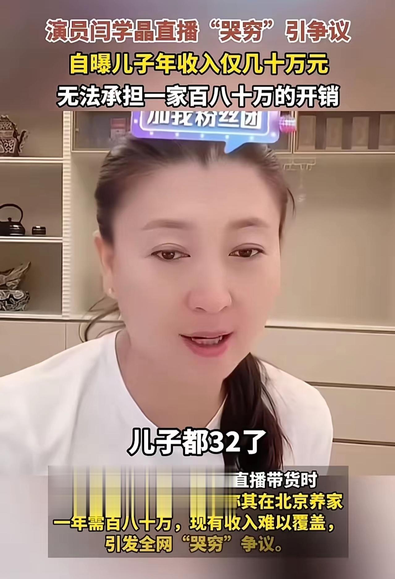 其实闫学晶的本意不是“炫富”,只是对着网友们哭诉自己当妈的不容易,自己的儿子都已经32岁了,成家立业了,现在还挣不到自己的一年花销,还需要当父母的去帮衬,觉得儿子不够出色。