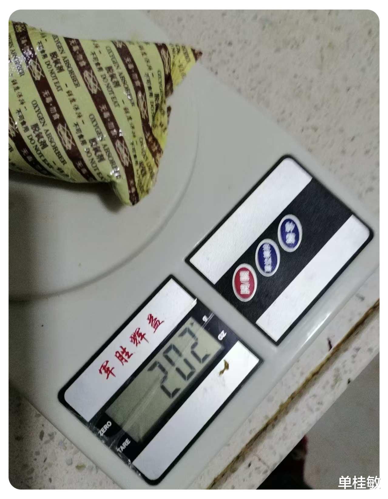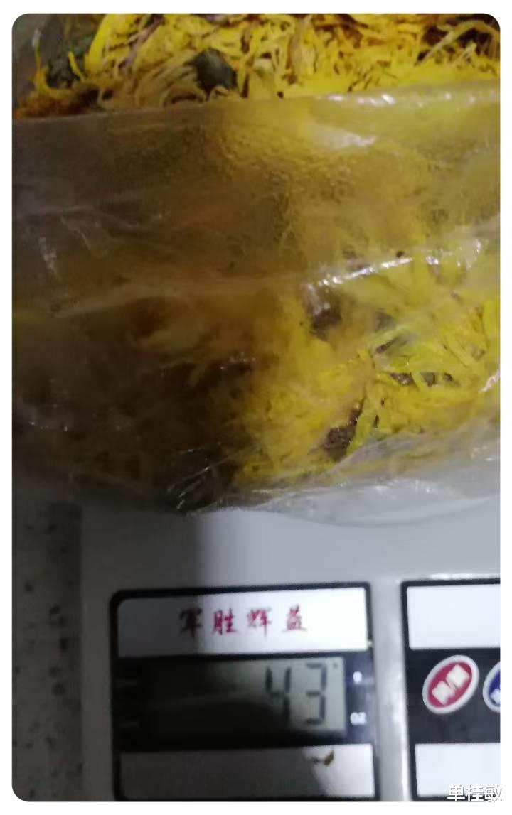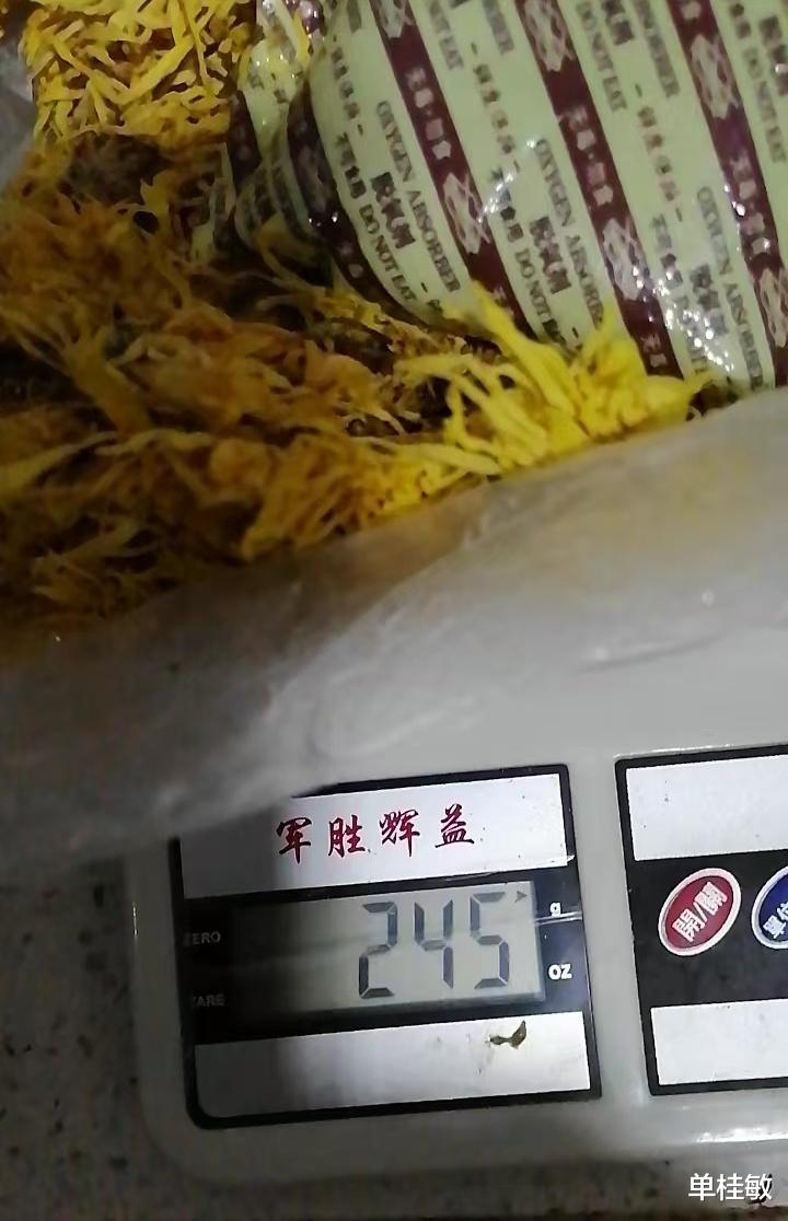 于是我拆开包装,我看着干燥剂很沉很沉,我当时好好信,我用我们家的小天平量了一下,250克的金丝皇菊里面干燥剂就占了202克,然后我又量了一下金丝皇菊是44克,加到一起246克。