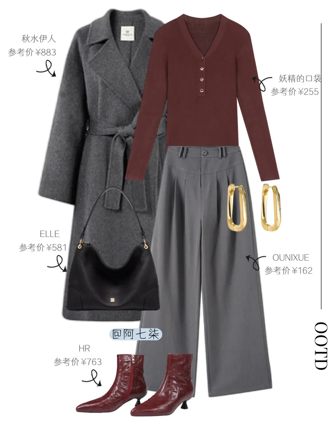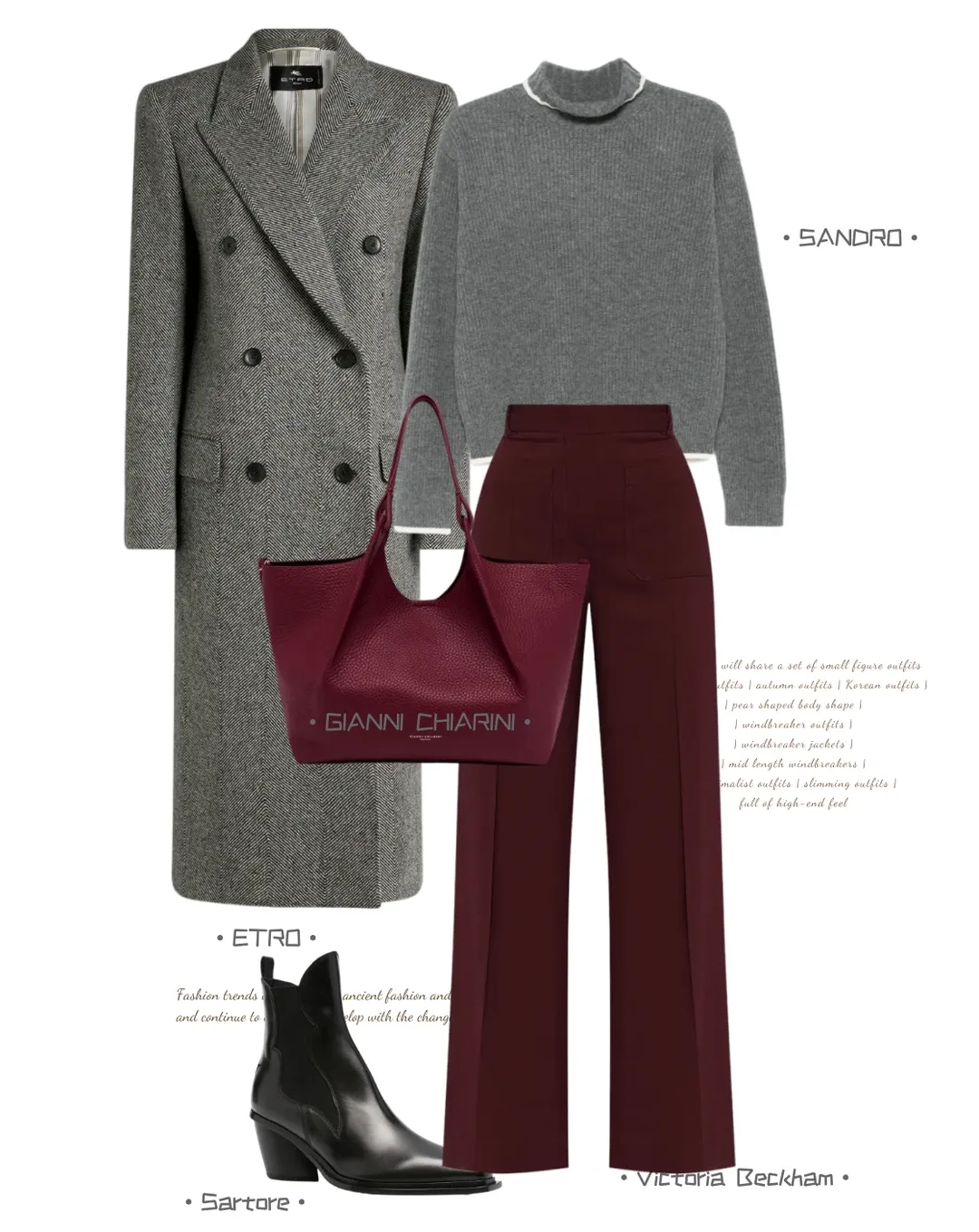 灰调的克制裹着酒红的柔艳,温柔又有底气。灰色大衣一裹就自带温柔滤镜,收腰刚好掐出纤细比例,内搭白色灰色针织,保暖又有层次;酒红阔腿裤衬得肤色软乎乎的,配上同色系托特包,复古感直接拉满!