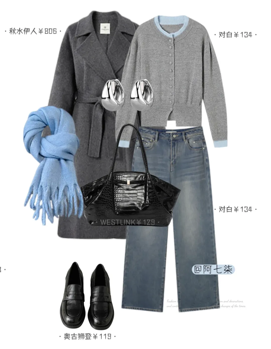 灰蓝组合清爽又高级,以质感灰大衣作基底,揉进浅蓝元素点睛 ,比如蓝围巾撞灰开衫,搭阔腿牛仔藏肉又随性;蓝边开衫配同色系围巾,叠穿层次拉满,搭垂顺阔腿裤更显利落。