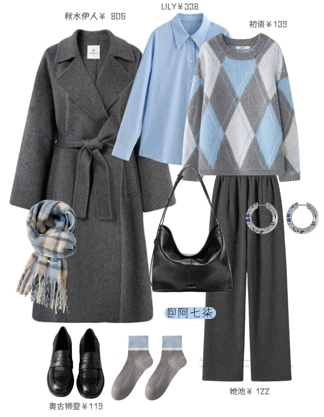 灰大衣内搭格纹毛衣,菱格毛衣混浅蓝调,下身可以配灰色百褶裙、阔腿裤,衬得身形舒展。如果想要突显层次感,可以给毛衣叠蓝衬衫,围巾、袜边呼应蓝调,黑包稳撑质感。