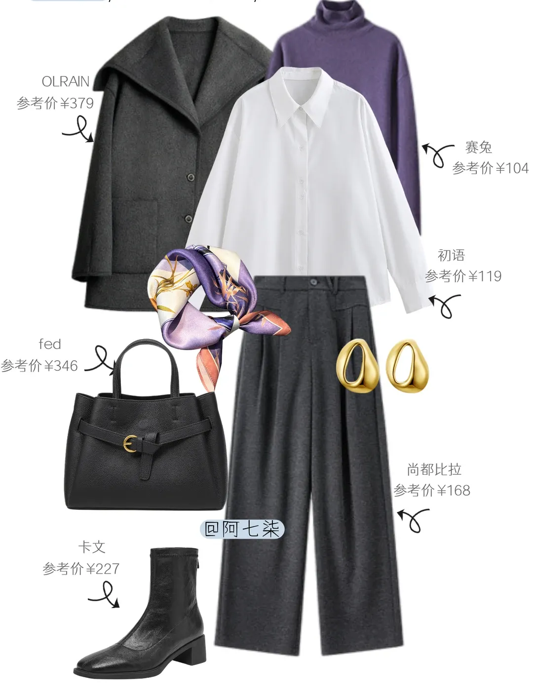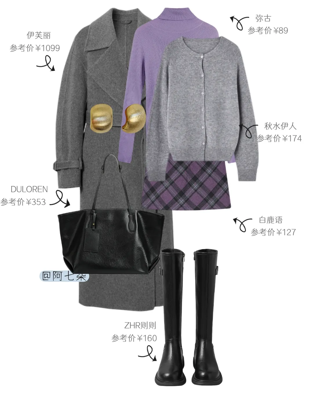 灰紫松弛系穿搭,灰的克制裹着紫的柔,把温柔显贵焊在了日常里。以低饱和灰作基底,揉进柔调紫调。灰大衣稳撑质感,或叠紫开衫配格纹围巾添暖调,或用白衬衫 + 紫毛衣露边做层次;下装不管是垂顺阔腿裤还是柔感半裙,都藏肉适配办公久坐节奏。