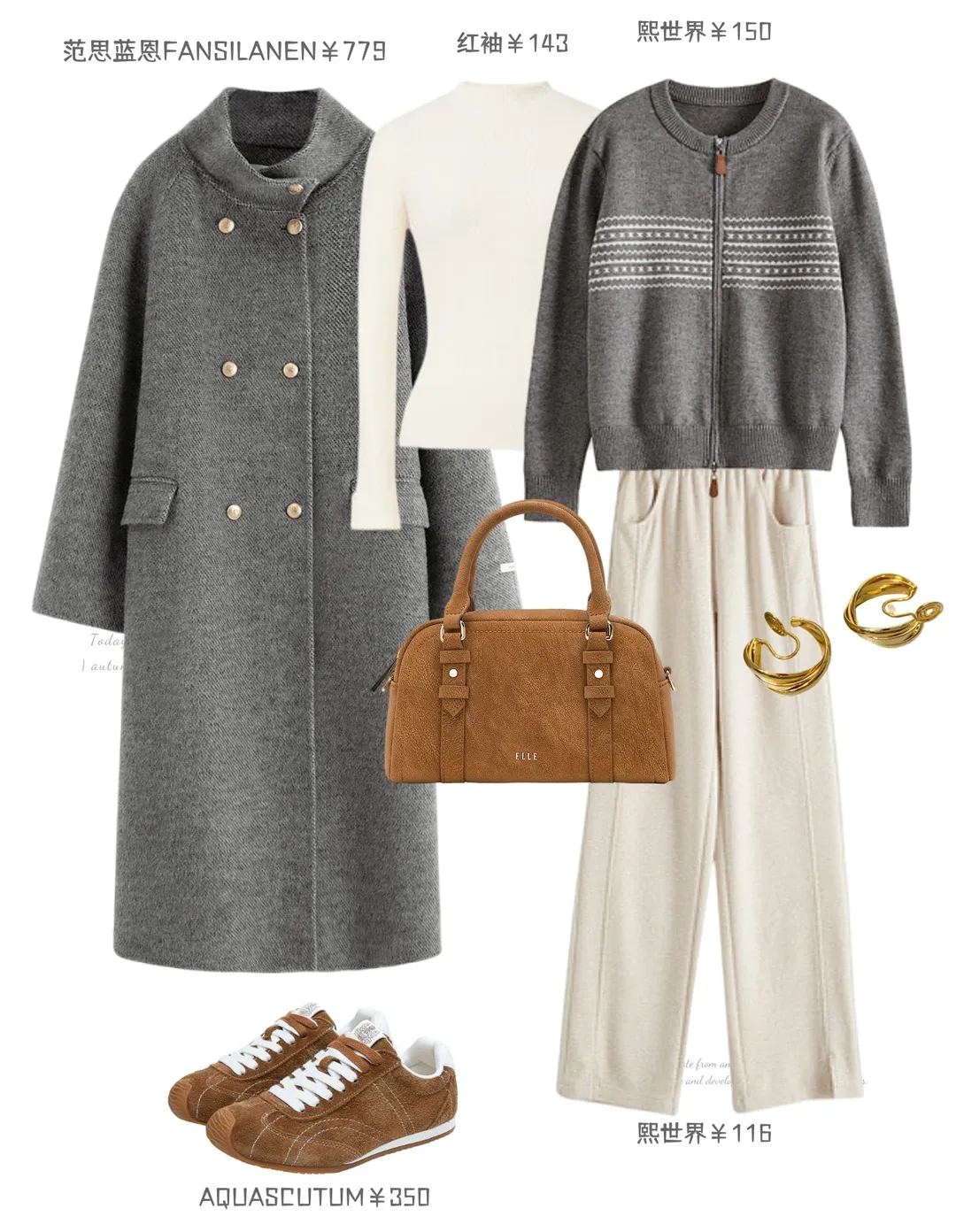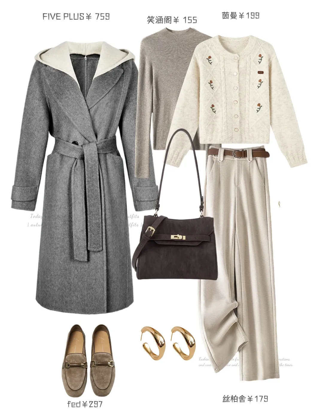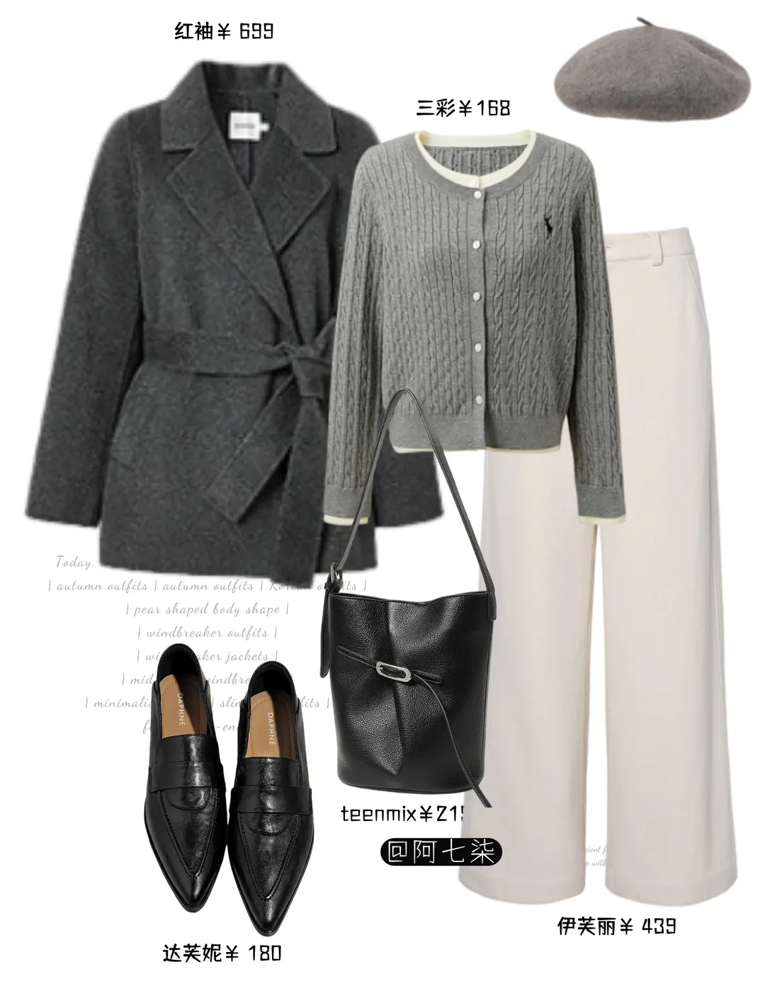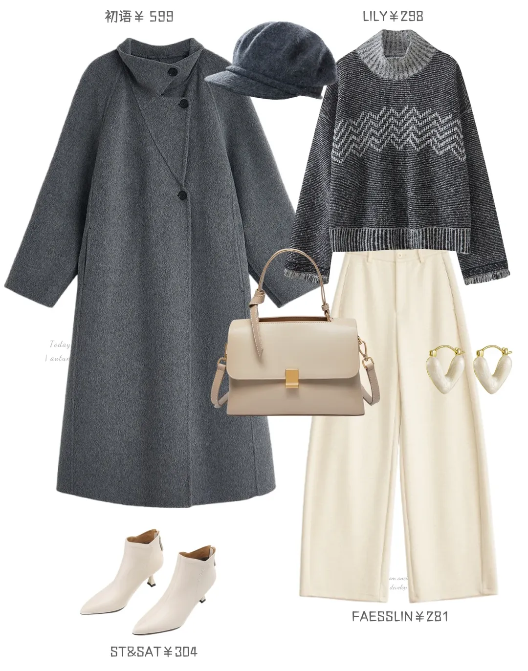 灰大衣内搭的浅灰打底是隐形的暖,叠穿上米白开衫,藏着不张扬的小浪漫,连纽扣都漫着软甜的气息,浅米色阔腿裤垂得轻软,与上衣正好呼应起来。