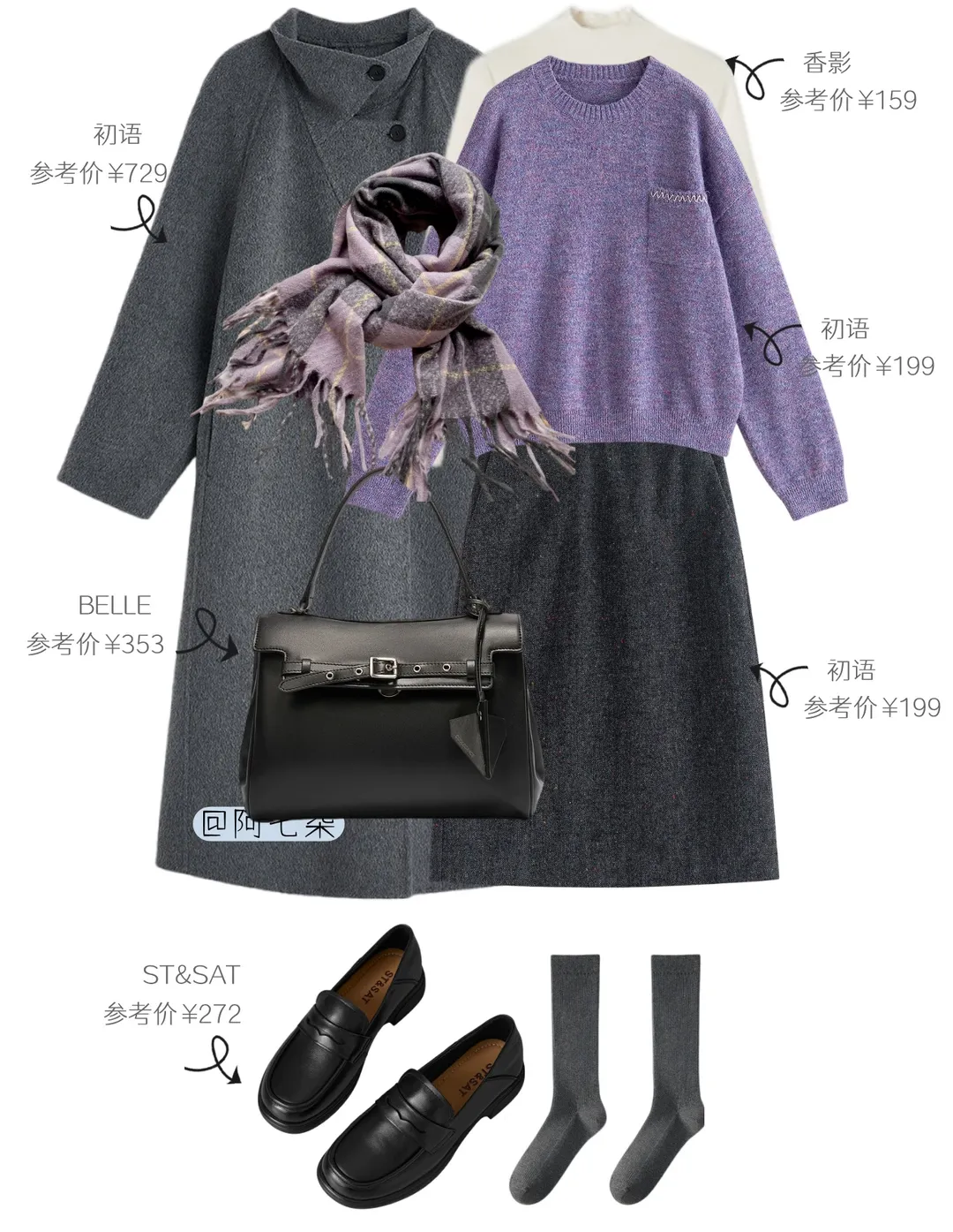 配饰更懂通勤松弛感,同色系紫袜呼应上衣,黑包黑鞋压稳柔调,金饰、丝巾轻戳精致感,甜而不腻。