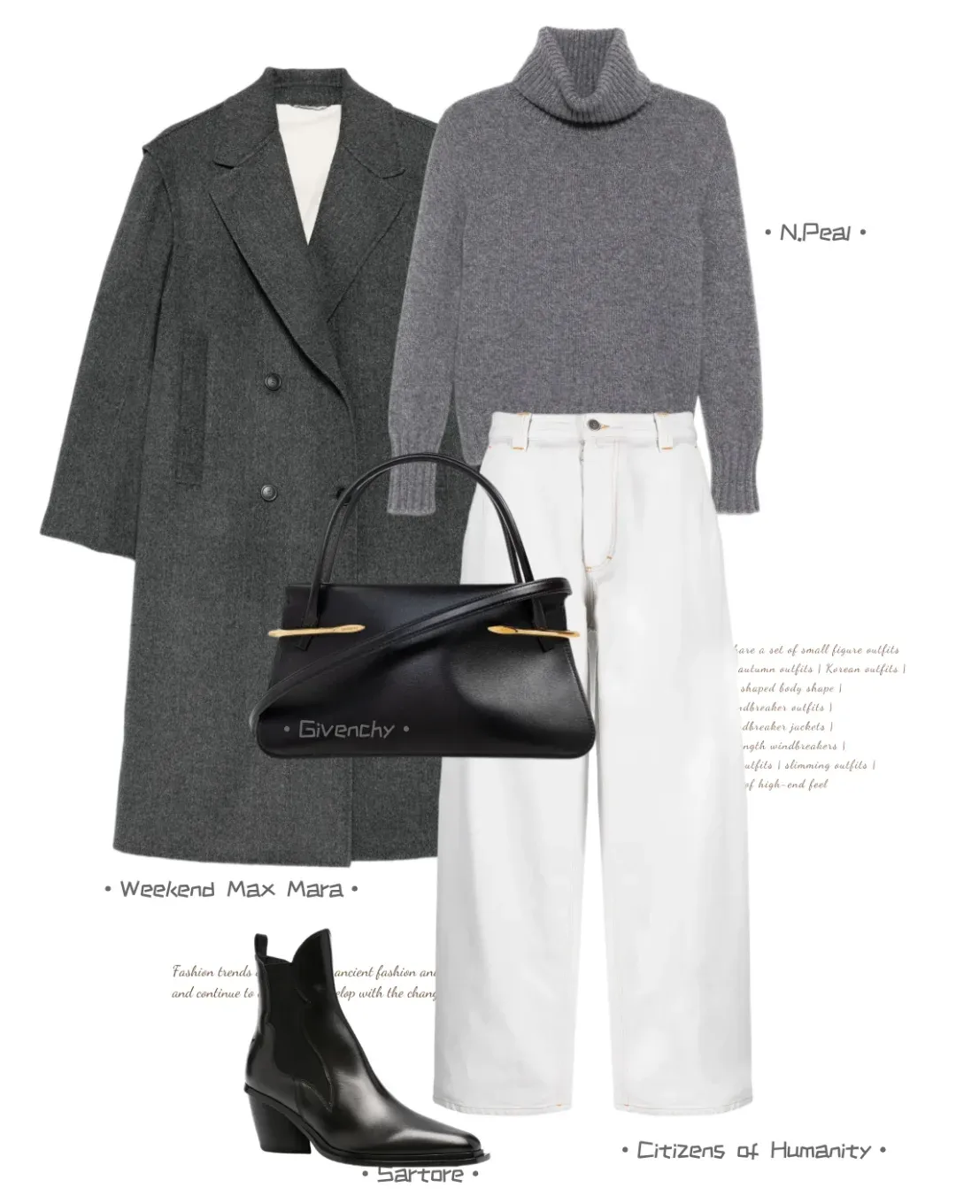 深灰大衣 + 浅灰内搭,靠深浅度拉开层次,不用费心配色,自带高级氛围;白 / 米白阔腿裤中和灰调的厚重感,轻盈又显高,小个子也能 hold 住。