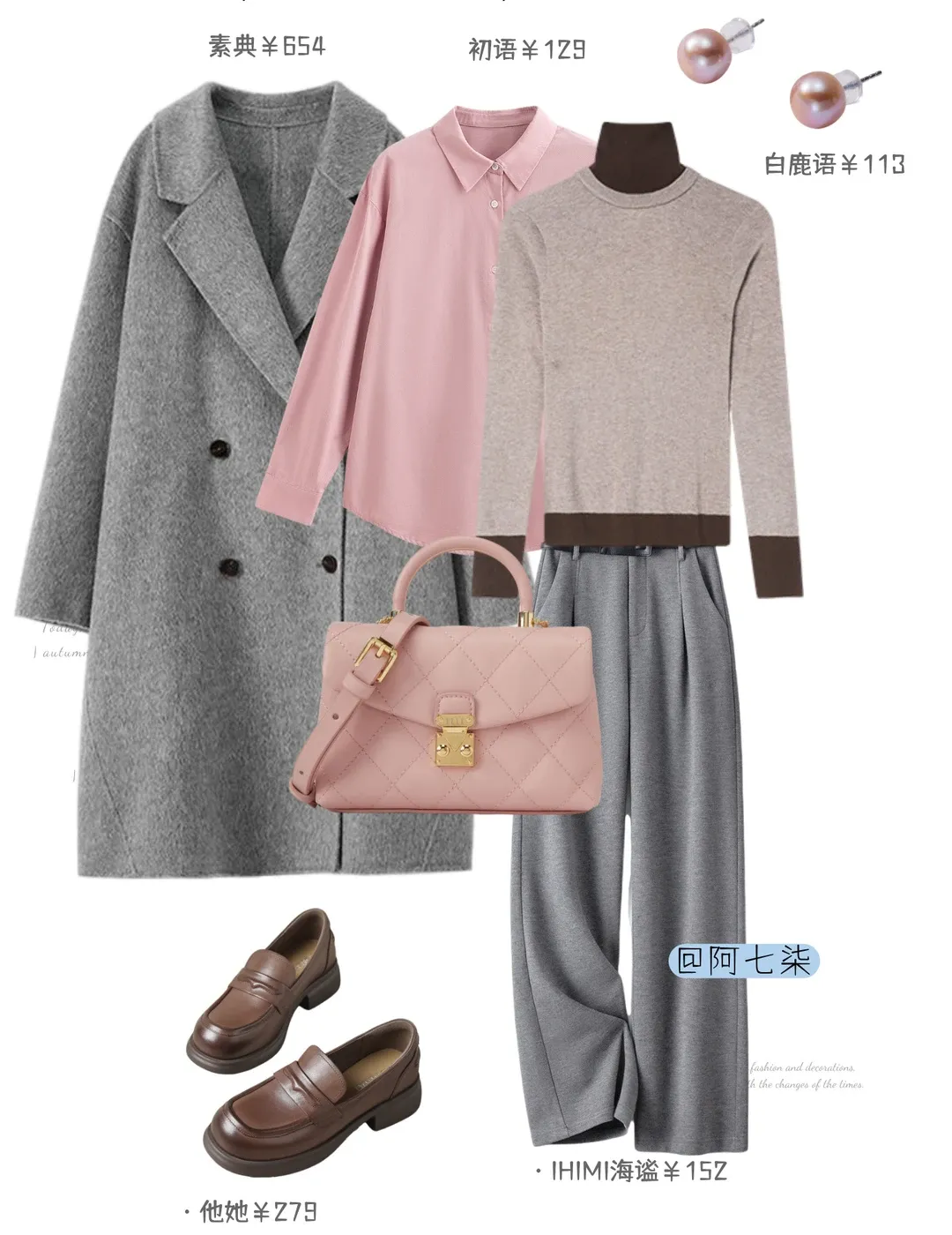 给灰大衣内搭粉衬衫,再叠浅咖高领毛衣,粉菱格包戳中甜意,棕乐福鞋 + 珍珠耳钉衬得气质软而不垮。淡色系混搭温柔又显贵,通勤穿刚好拿捏松弛精致感。