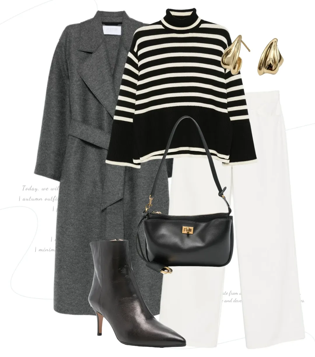 灰色大衣内搭高领条纹毛衣,条纹像是将黑白琴键织进领口,白裤垂着哑光的软,与条纹的利落衬得刚好,金耳饰与包扣的金遥遥应和,每一处细节都轻得刚好。