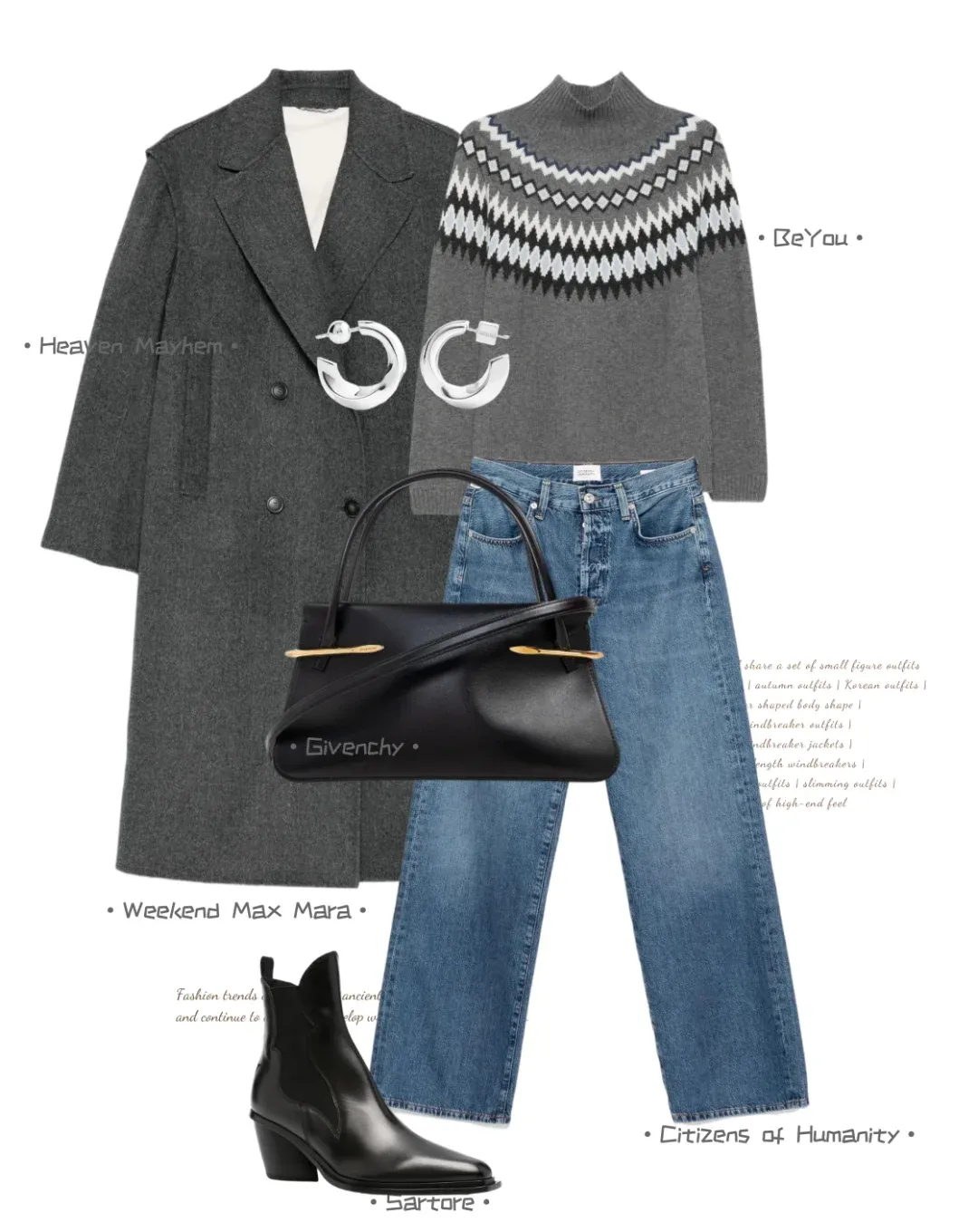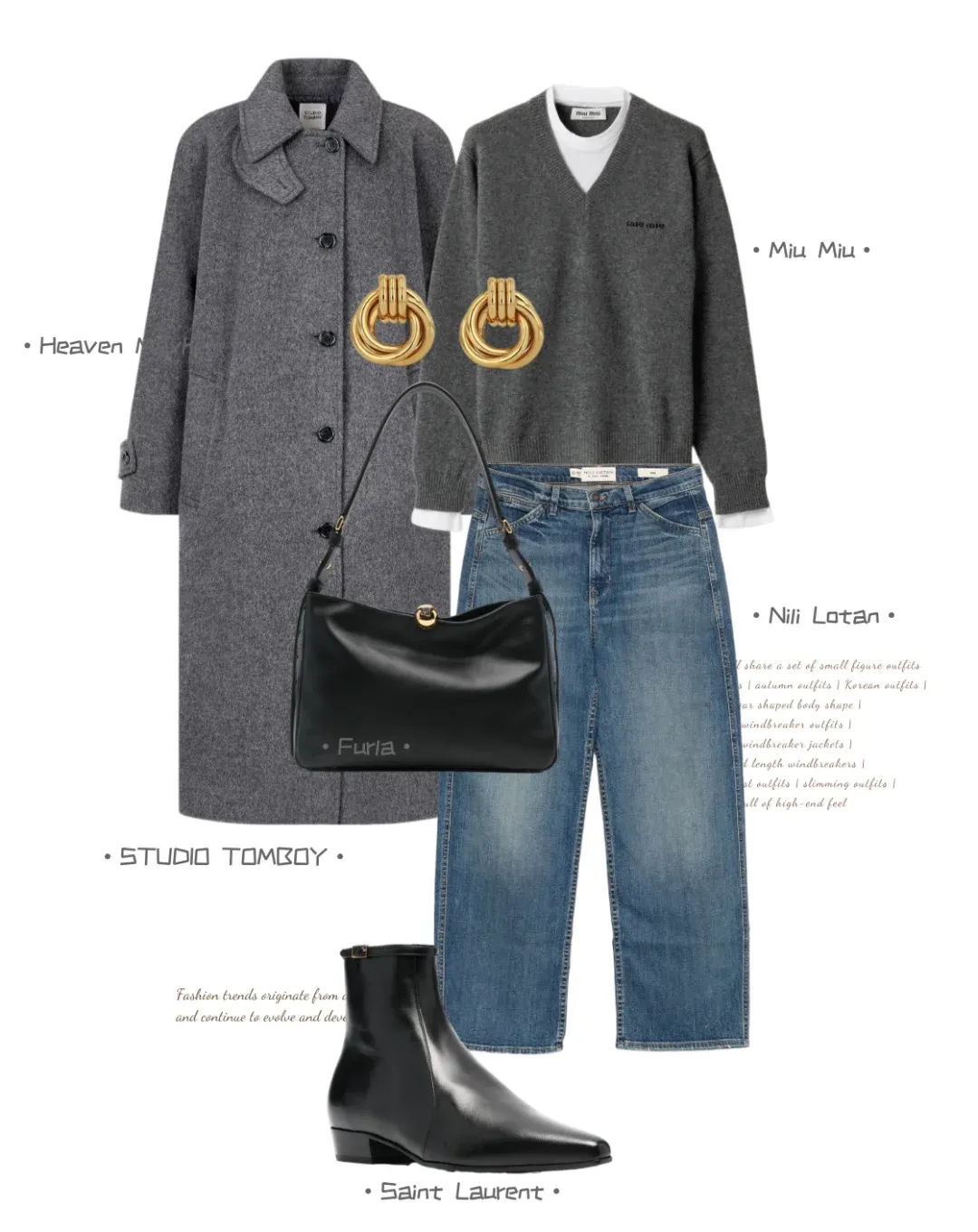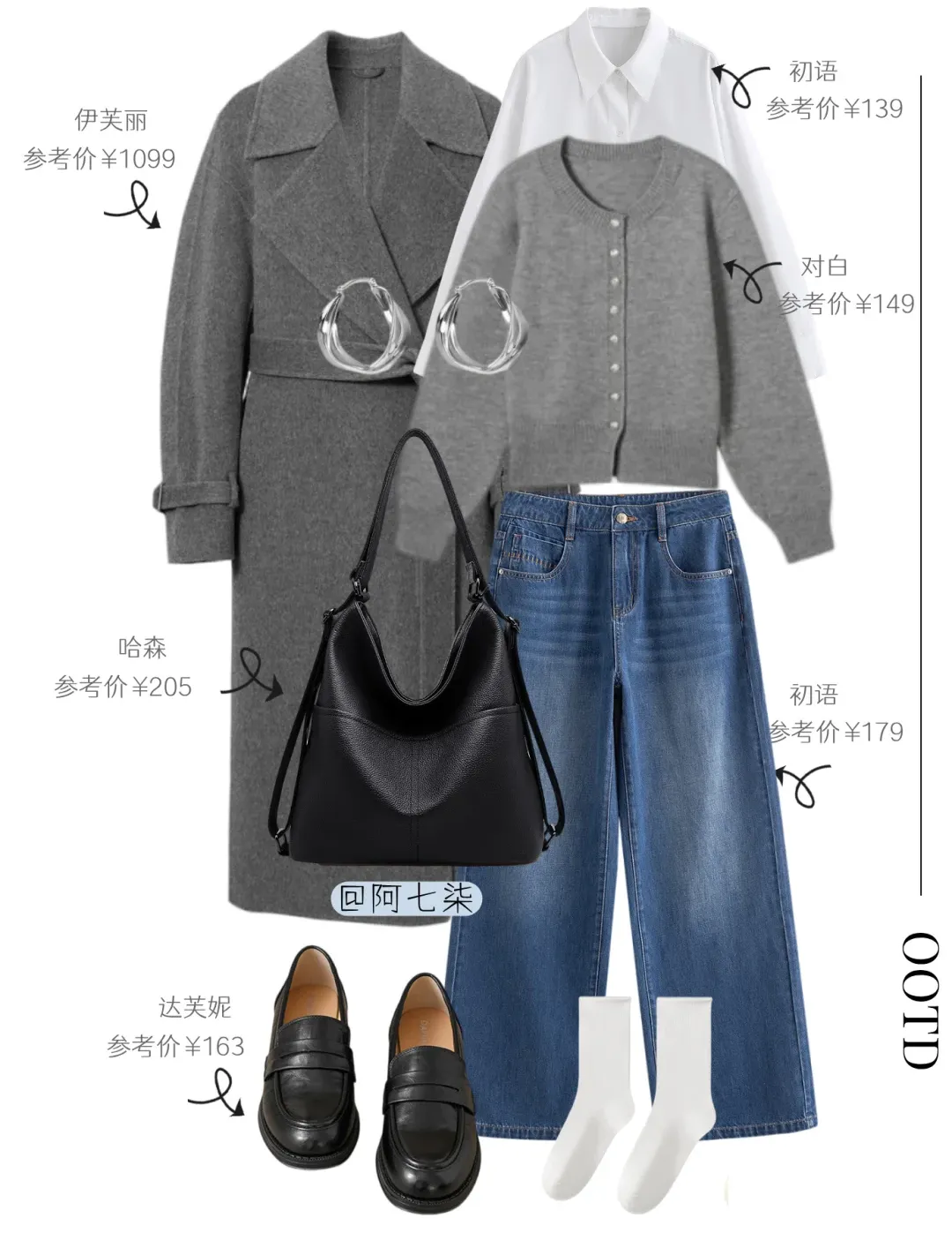 灰色大衣搭灰毛衣,毛衣上的一点白添轻盈层次,阔腿牛仔藏肉又随性,黑金配饰 + 黑包黑靴,轻戳精致不浮夸。